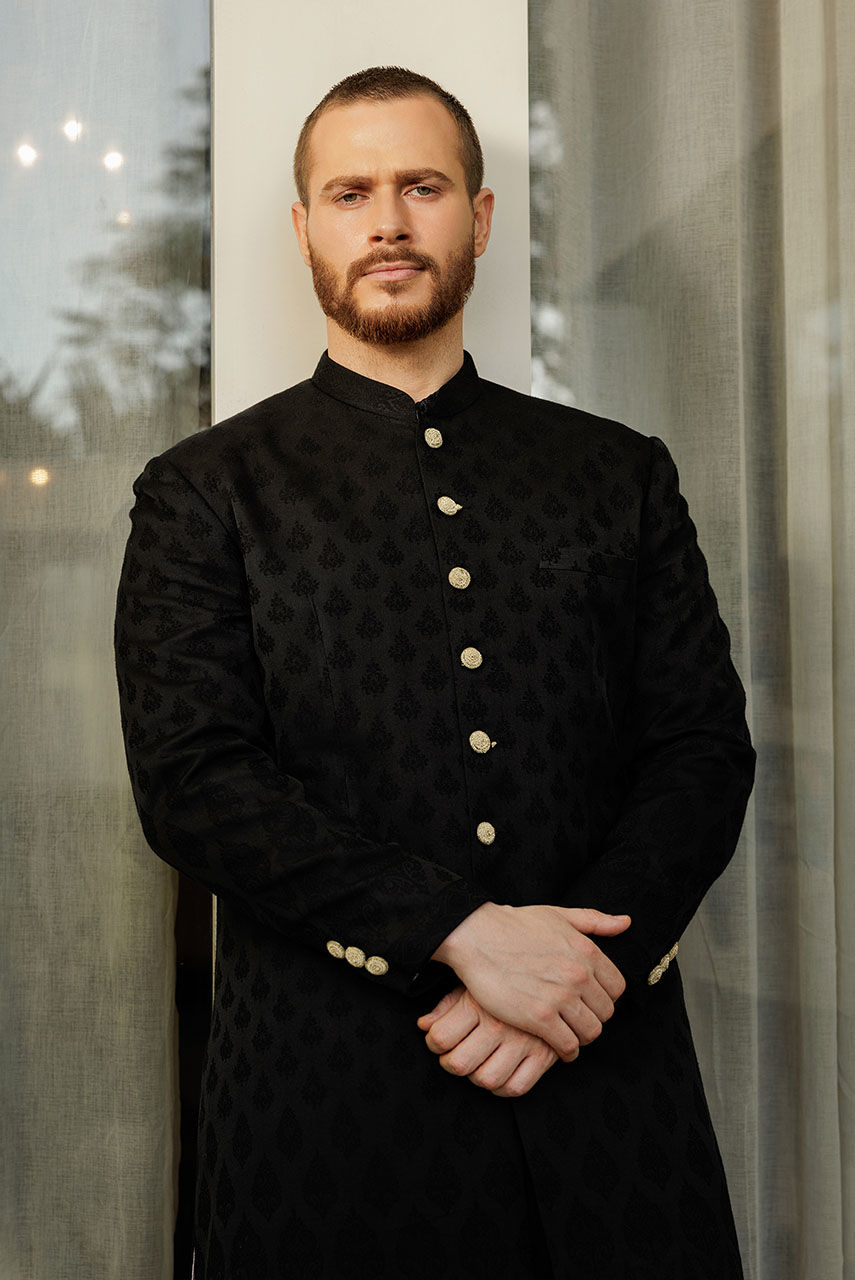 Make a bold statement with this exquisite black sherwani, a perfect blend of tradition and modern sophistication. Intricately embroidered motifs adorn the rich fabric, adding depth and artistry to its timeless silhouette . The refined handworked buttons serve as the perfect finishing touch, enhancing the sherwani’s regal appeal with intricate detailing.