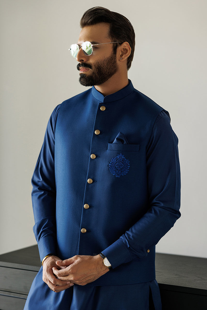This navy blue suiting fabric waistcoat exudes sophistication and luxury, featuring iconic DP logo and embellished with stunning dull gold buttons. The deep hue lends an air of timeless elegance, while the bold DP logo add a touch of signature style. Perfect for formal events or upscale occasions, this waistcoat effortlessly combines classic charm with modern flair, making a striking statement in any ensemble.