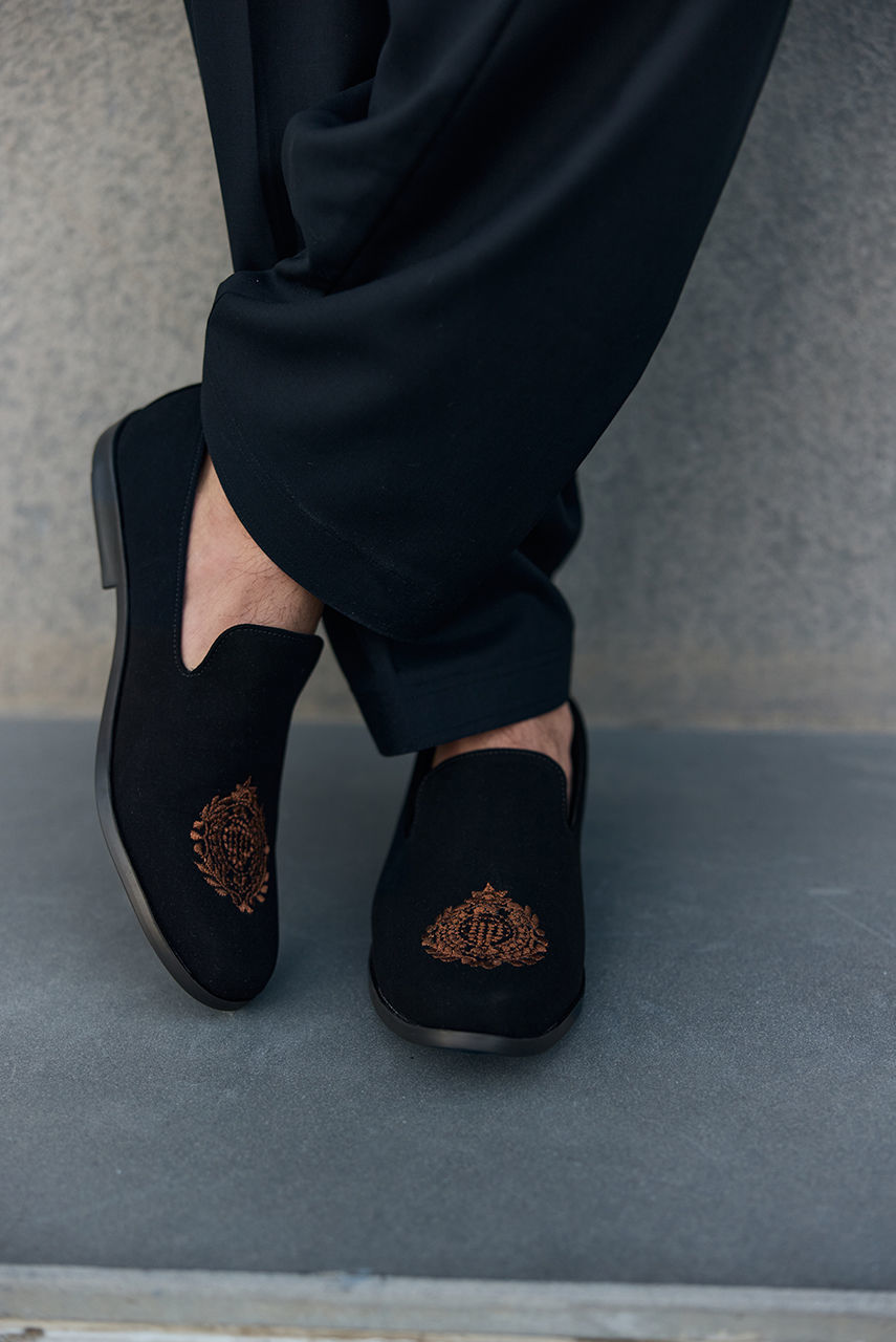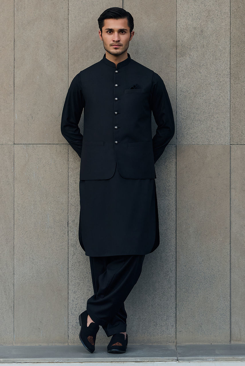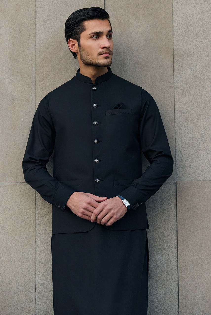The Midnight Noir Ensemble Exude timeless sophistication with this monotone black ensemble, designed for the modern gentleman who values understated luxury. This set features a meticulously tailored kurta and shalwar crafted from premium Boski Linen, offering a fluid drape and breathable comfort suitable for any season. The look is elevated by a structured waistcoat made from high-quality suiting fabric. Featuring a classic mandarin collar and accented with distinct metallic buttons, the waistcoat adds a layer of refined structure to the silhouette. Perfect for festive occasions and formal gatherings, this outfit strikes the perfect balance between traditional charm and contemporary class.
