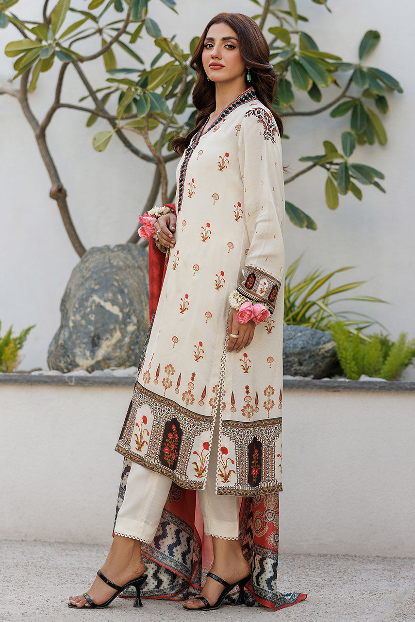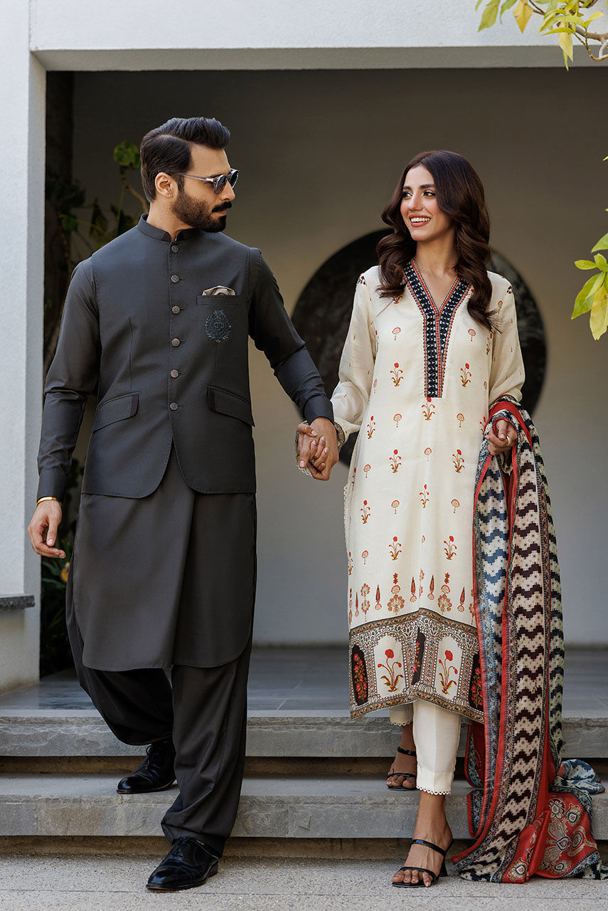 Inspired by the iznik motifs this outfit is a modern take on the heritage textile. The off-white shirt featuring an embroidered neckline is paired with a burnt orange dupatta that gives it a modern twist.