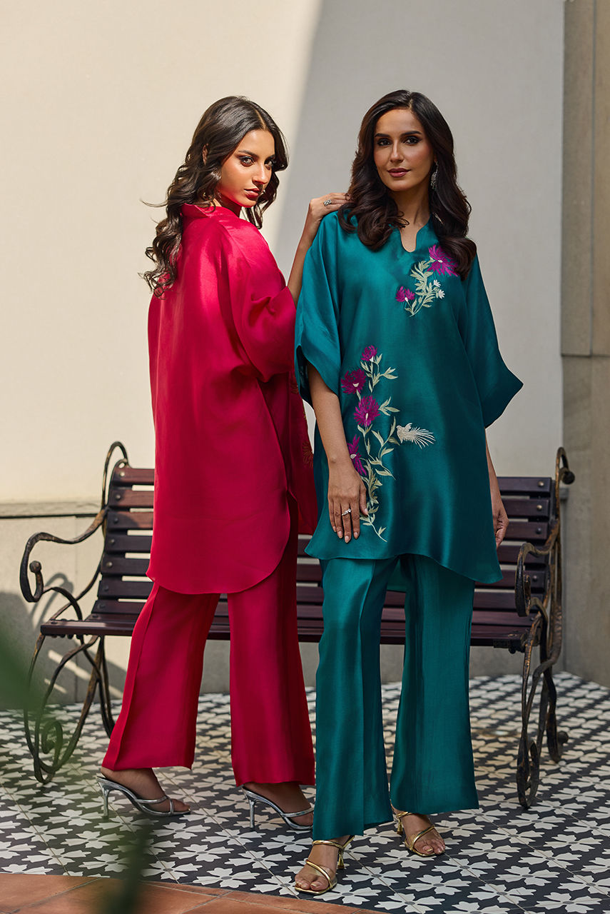 A batwing shirt with bootcut pants featuring A finely detailed thread-embroidered happy motif inspired by the delicate beauty of plum blossoms. The design blends symbolic floral elements with clean, balanced embroidery, creating a graceful and contemporary interpretation. This piece makes a perfect pret wear with a modern fusion silhouette