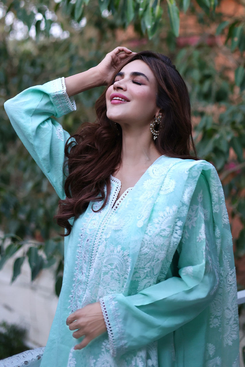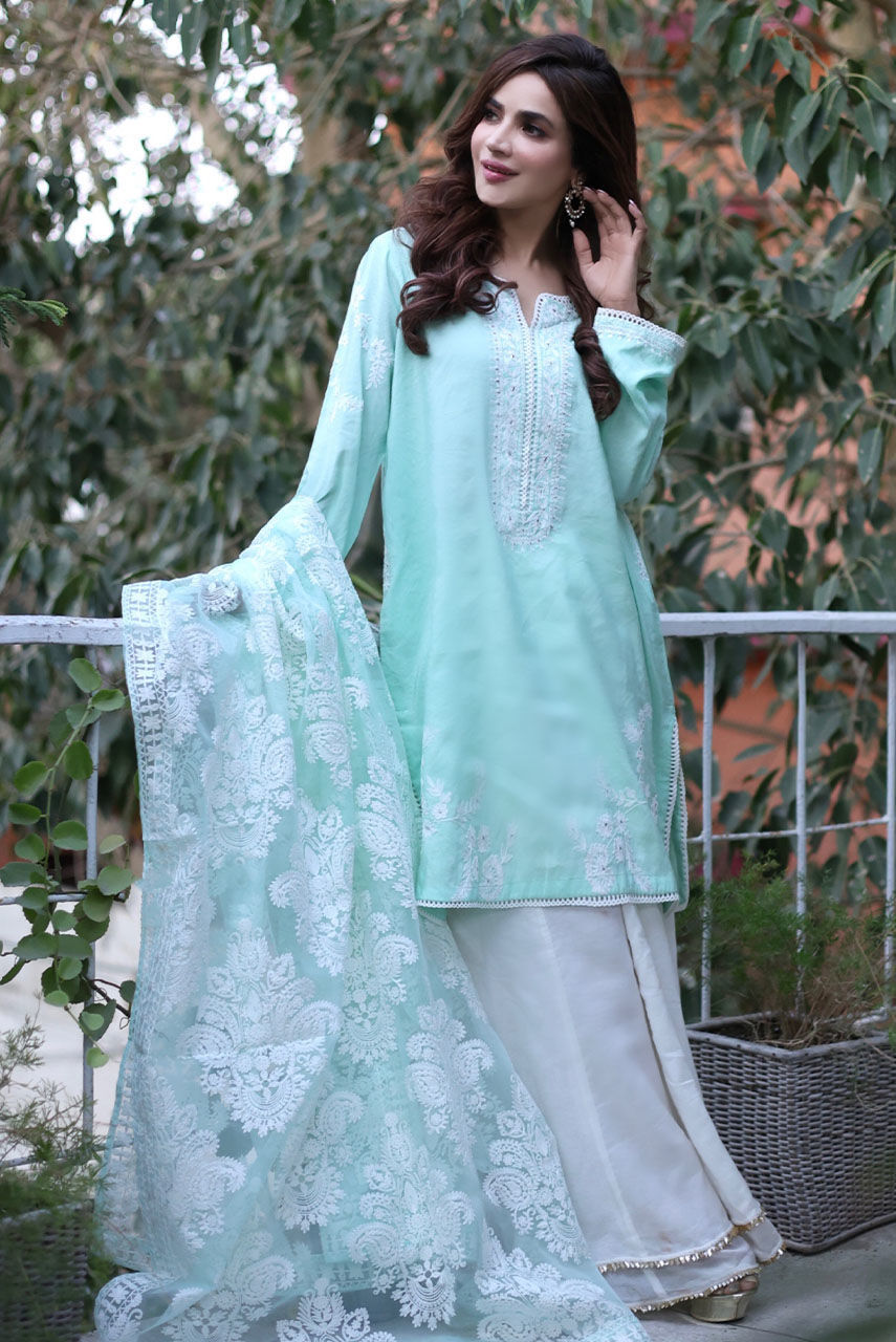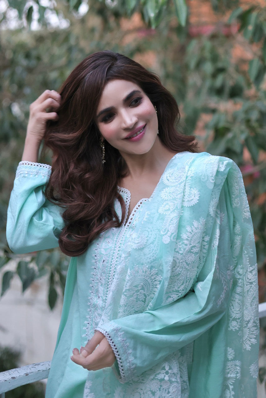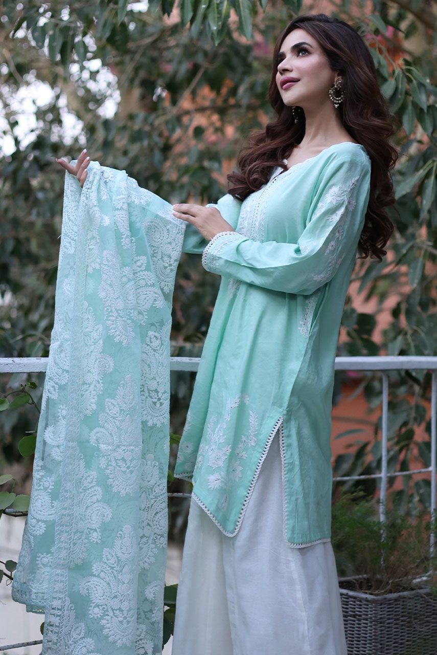 A mint green cotton net kurta with heavy embroidery on the neckline and a fully embroidered dupatta.