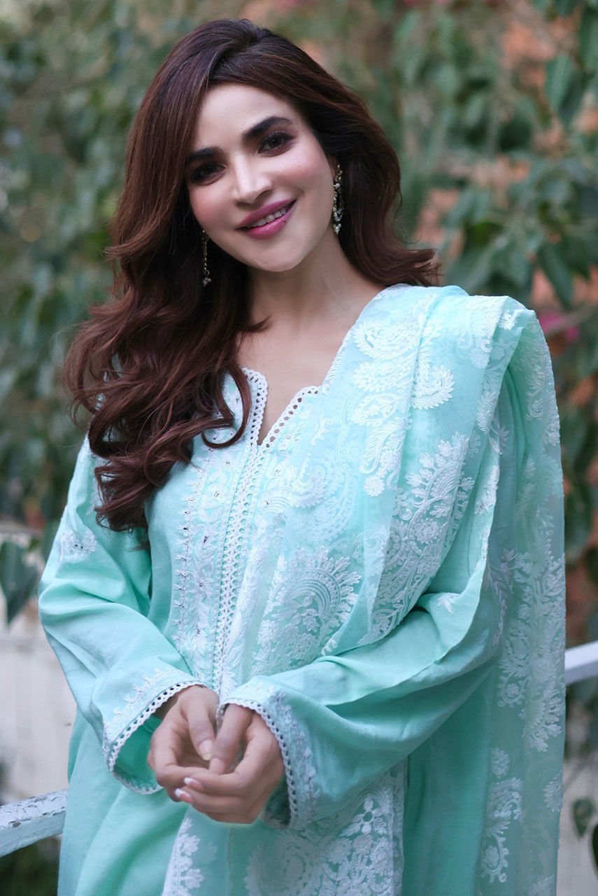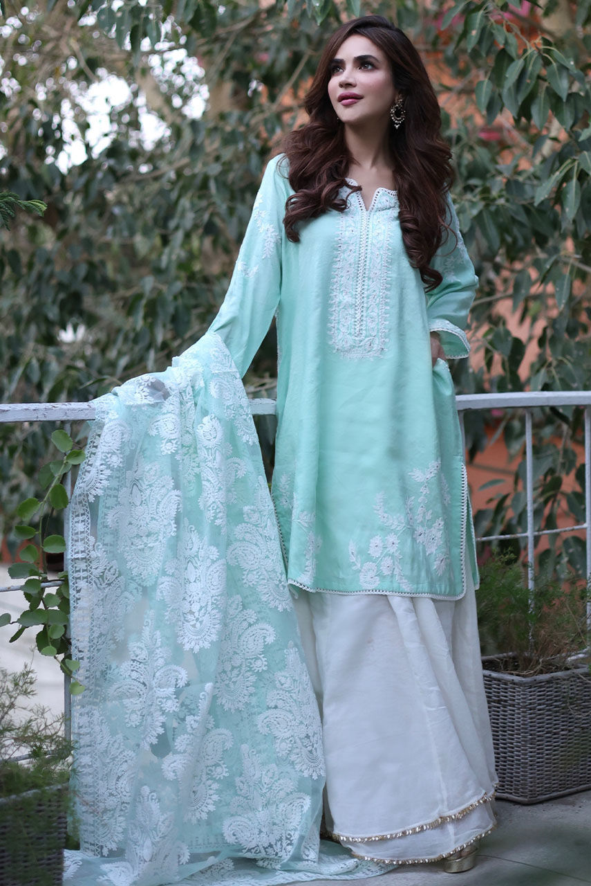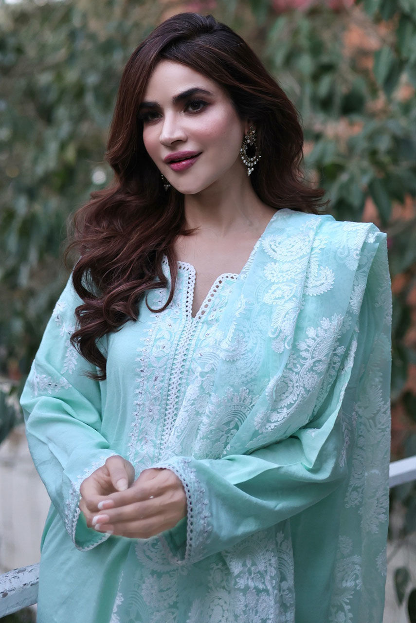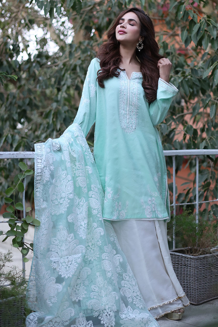 A mint green cotton net kurta with heavy embroidery on the neckline and a fully embroidered dupatta.