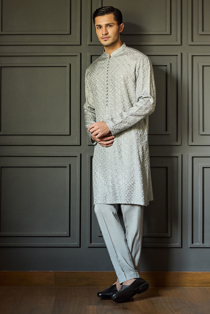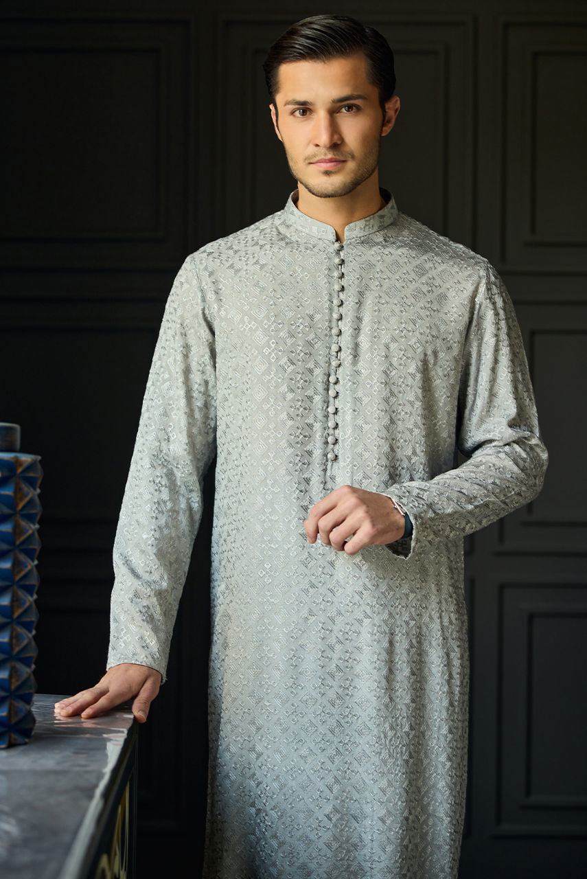 The Signature Grey Chikan Ensemble Define your festive wardrobe with this understated yet luxurious grey ensemble. The centerpiece is a meticulously crafted Kurta Shalwar in intricate Chikan fabric, offering a textured, airy feel perfect for the season. It is paired with a premium Raw Silk waistcoat that adds a layer of smooth structure and sheen. The look is finished with the signature Deepak Perwani logo embroidered on the chest pocket, serving as a mark of authentic designer craftsmanship.
