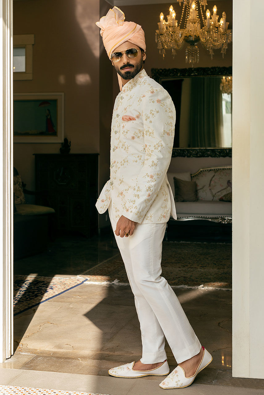 An off white raw silk prince coat with resham and hand embroidered jacket and buttons, can be paired with a raw silk trouser, raw silk khussa and an organza turban