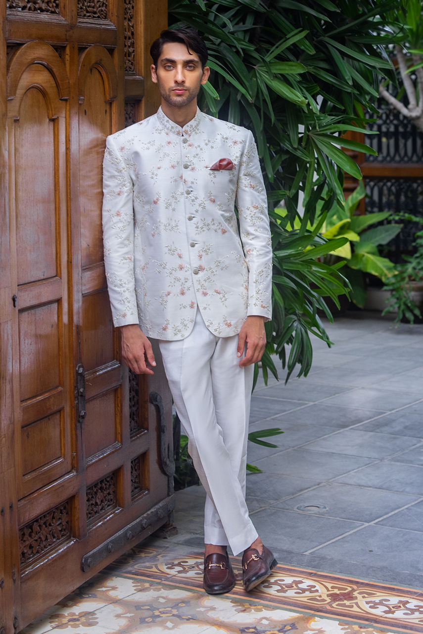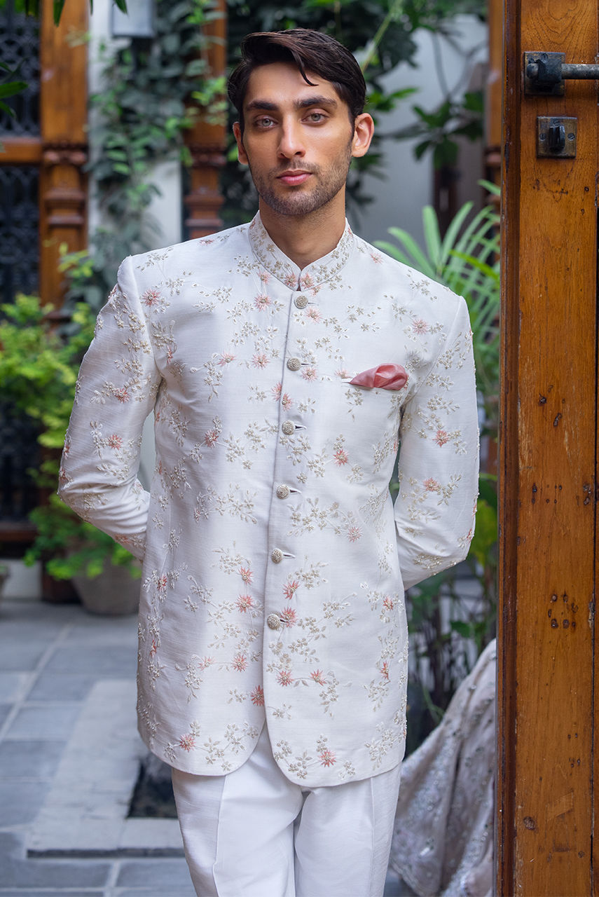 Make a grand entrance with our white raw silk Prince Coat, featuring exquisite resham and hand embroidery on the jacket and buttons. This meticulously crafted piece combines luxurious fabric with intricate detailing, making it the perfect choice for weddings, formal events, or any occasion where sophistication and style are paramount.