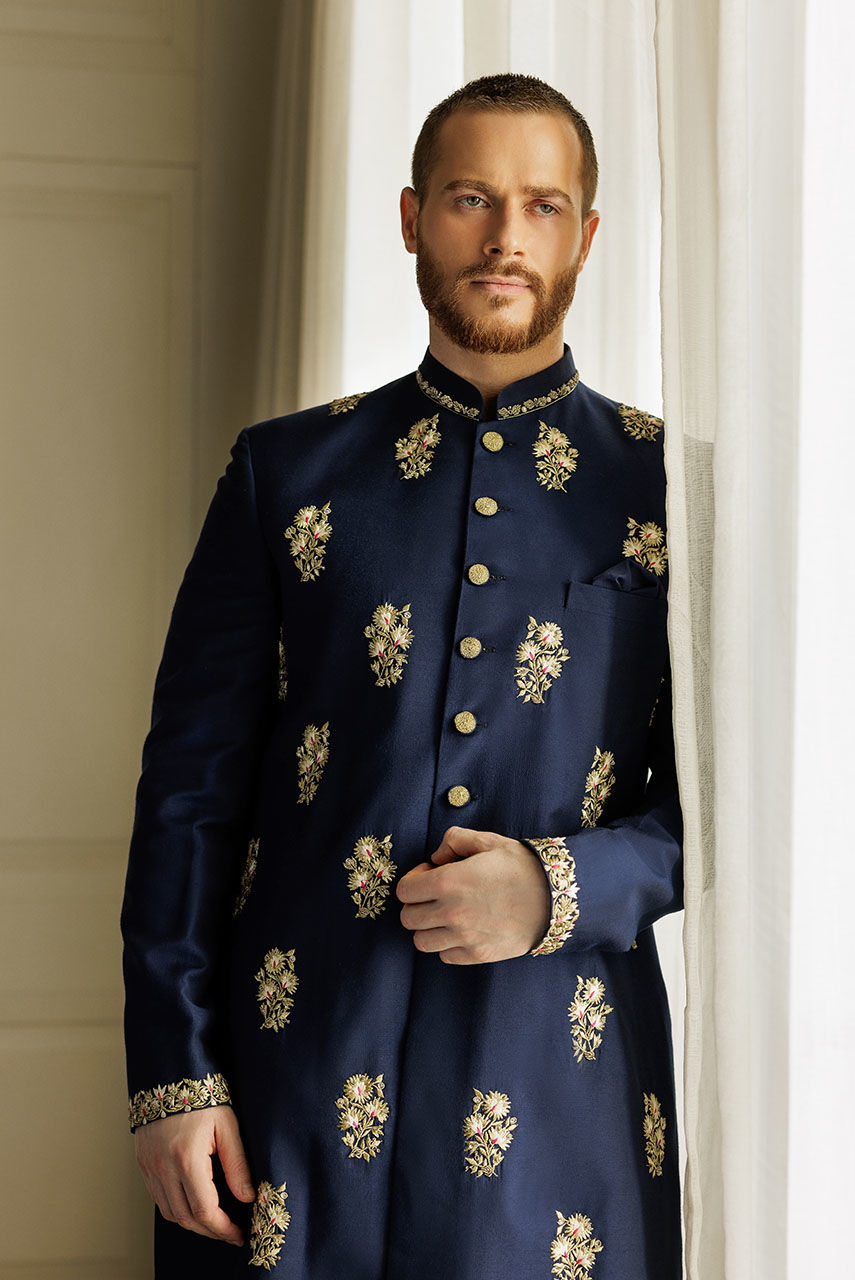 Step into sophistication with this exquisitely tailored blue suiting sherwani, adorned with intricate floral motifs. The minimal yet refined handwork on the collar adds a subtle touch of opulence. Perfect for weddings, receptions, or festive occasions, this sherwani is a seamless blend of modern refinement and traditional artistry - an ensemble that commands attention with effortless grace.