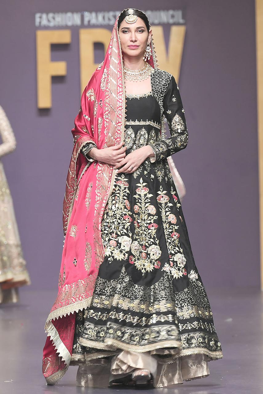 a classic black silk kalidar with extensive panels beautifully hand crafted with screen print, resham, mirror work and zardozi. It is paired ith a lam'e lehenga and a charmeusse silk shawl extensively hand block printed and worked with gotta, sequin and mirror work.