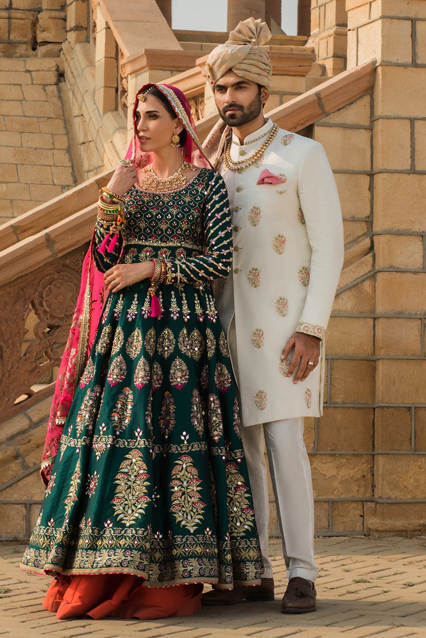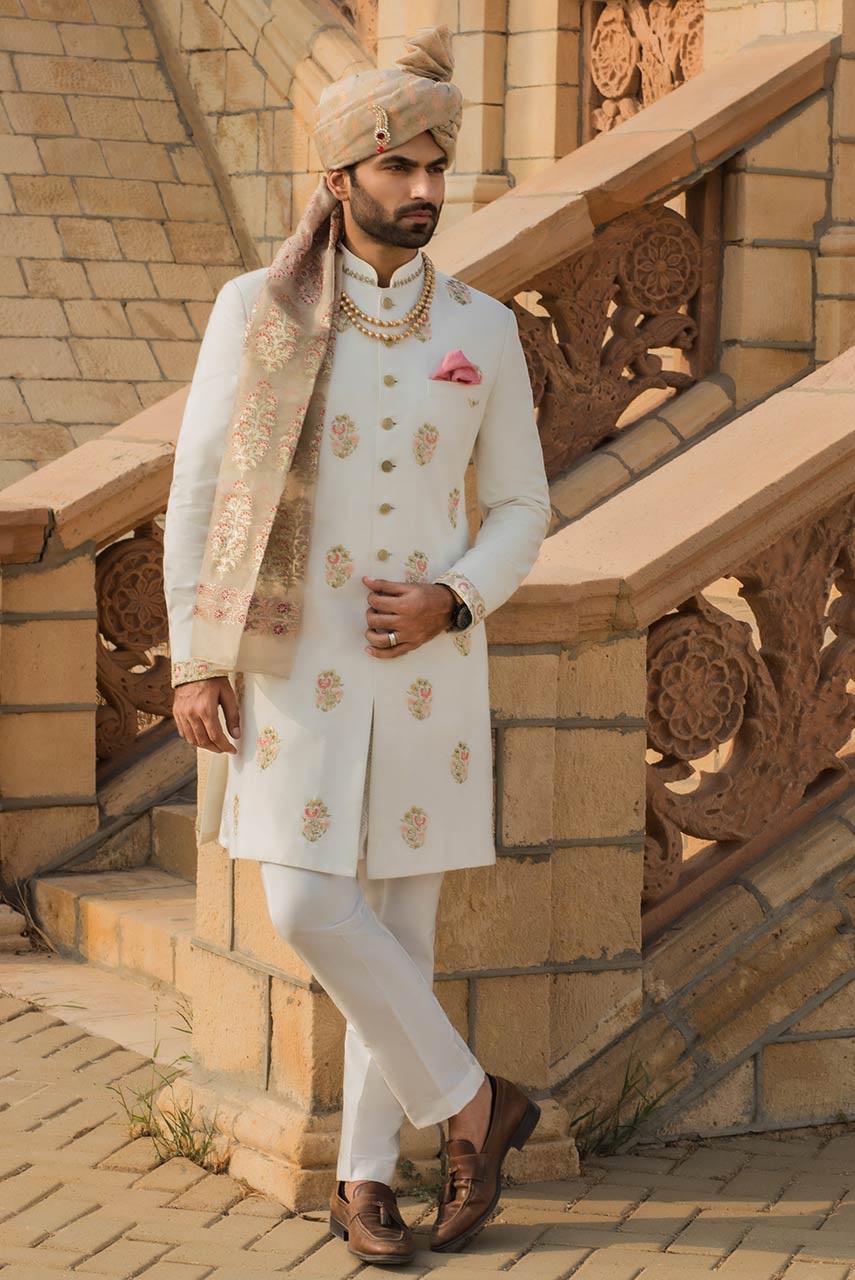 White suiting sherwani with embroidered motifs. Following can bought as addons: 1) A cotton silk inner suit 2) A screen printed turban to complete the look