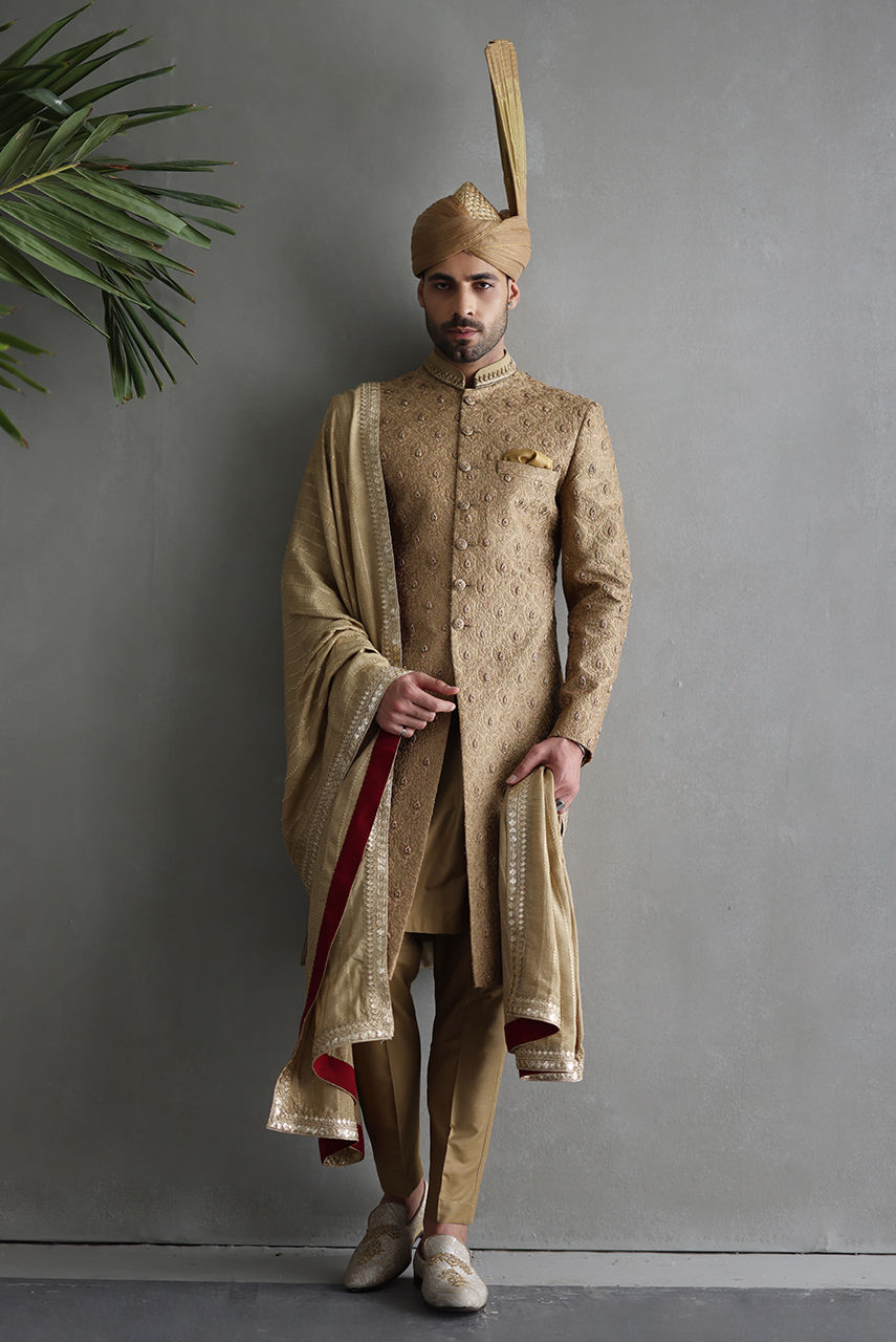 Gold sherwani fully hand embroidered with boti work on the collar, button and sleeves complimented with beige shawl.