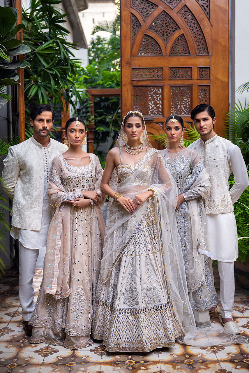 This dreamy bridal lehnga choli exudes modern and feminine charm. It is crafted in raw silk and tulle hand worked like a jewel piece In sequin, resham, zardozi and crystals. The bousteir shaped choli is extensively hand worked in crystals and sequin. The main dupatta in net features extensive hand work in resham, crystals and sequin. The second dupatta is in badla boti In organza.