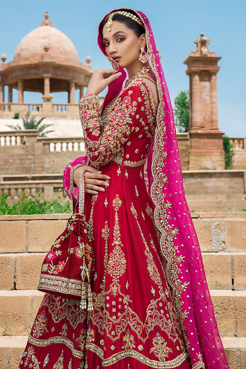 The glowing pink and Rosemary red attained along into a feminine, yet dominant look. This is a pure raw red silk dress that has all the intricate handwork of kamdani, zardozi, Resham and crystals. Also, the dupatta is a masoori net with the same techniques on the borders. The dress has choli cut lines and flared hem offering its sovereignty. This sensual form helps our bride stroll across the hall with grace, while she steals all the eyes for herself.