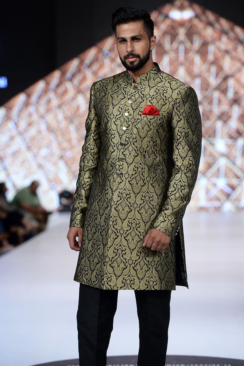 Classic sherwani in black gold in richly patterned brocade styled with straight pajama.