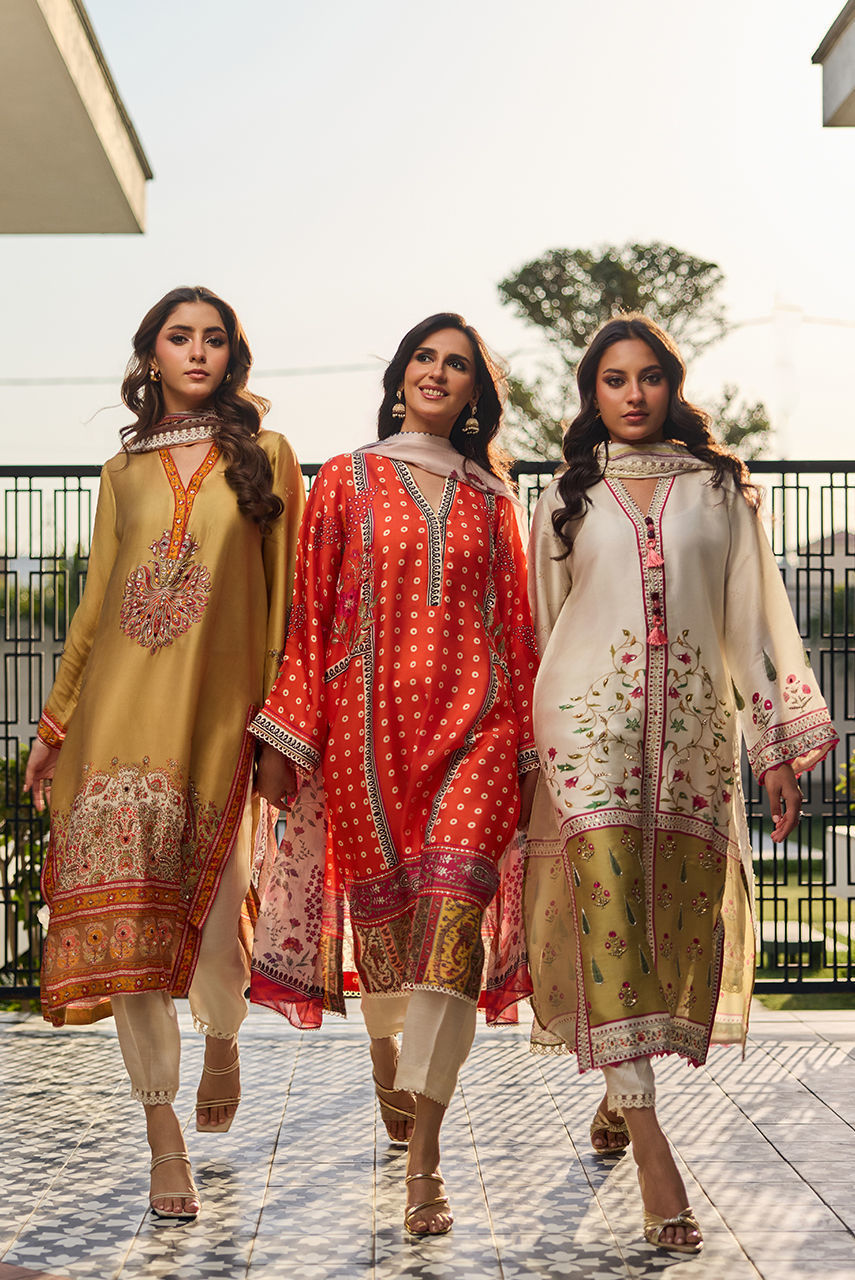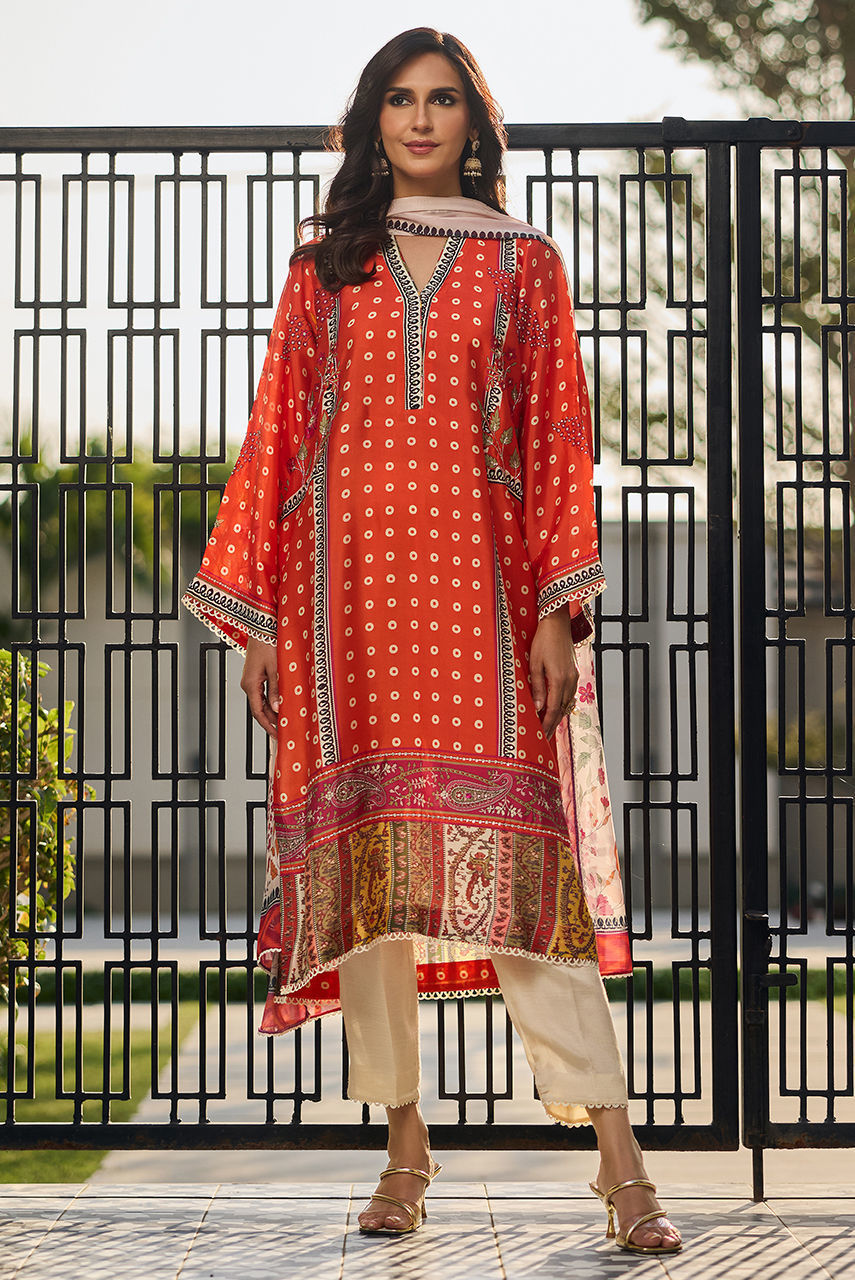 A print inspired by chunri in vibrant orange radiates tradition, celebration, and movement. Featuring hand work in sequin diamanté and beads. The printed silk dupatta is finished with lace. Paired with a lace detailing trouser