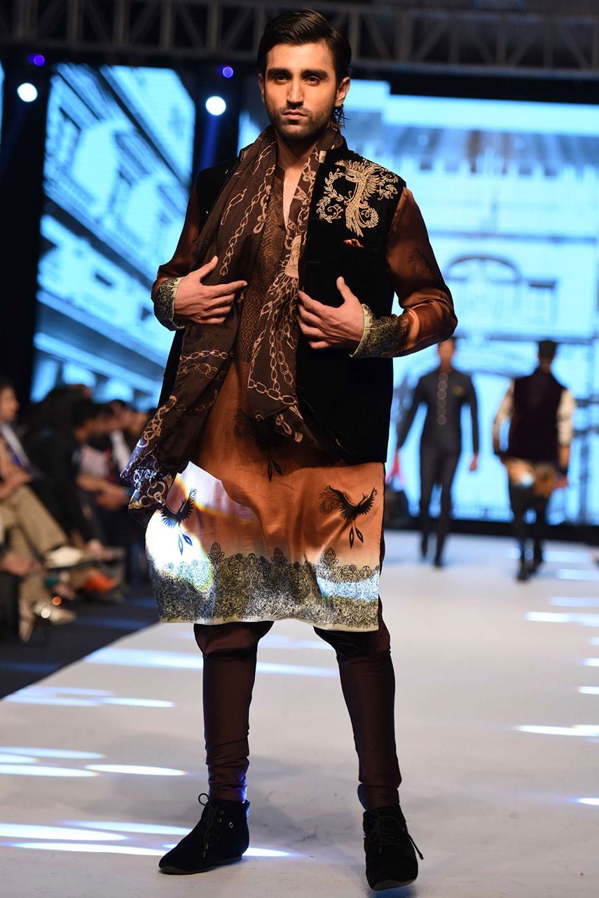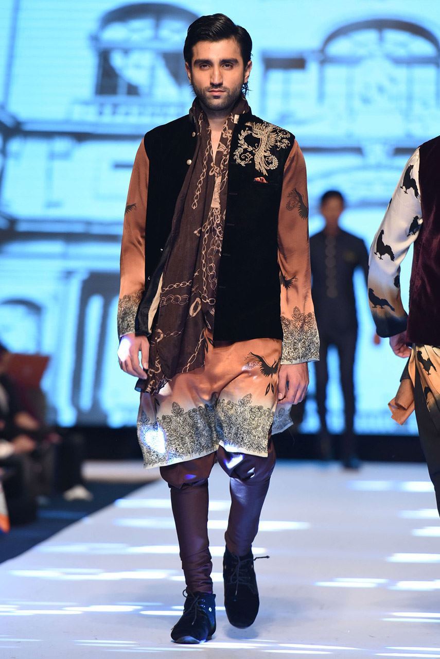 Charmeuse silk dyed and screen printed kurta with jodh puri pajama and velvet waistcoat with embroidery on shoulder.