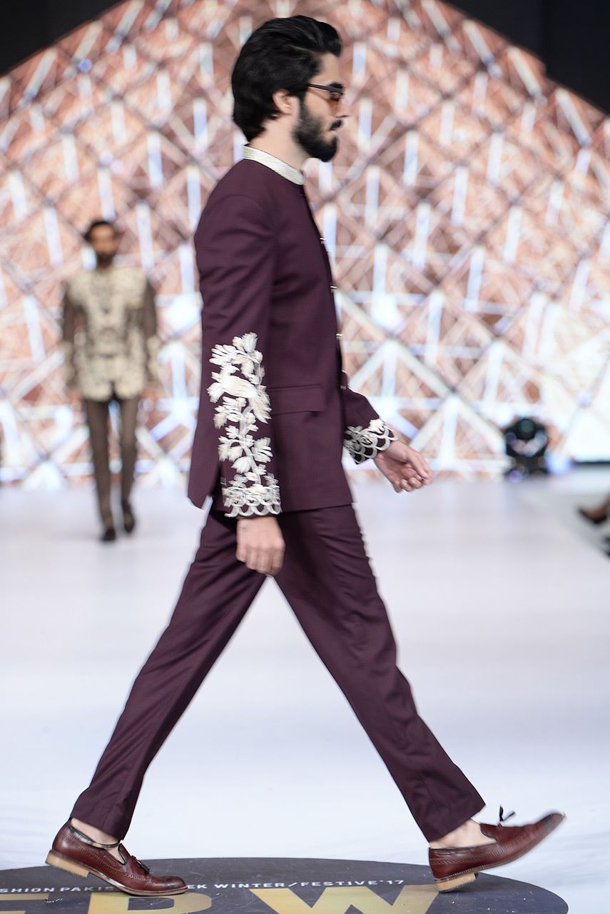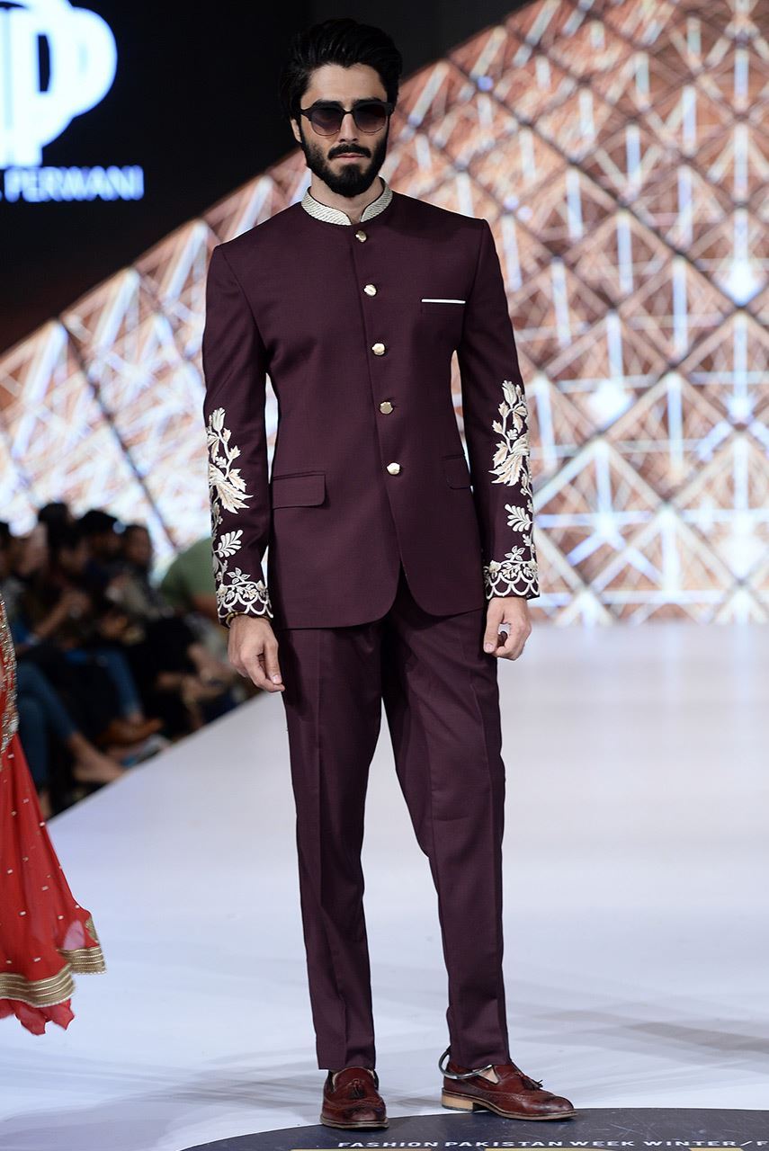 Classic plum colored button down  jacket with embroidered sleeves  styled with straight pants.