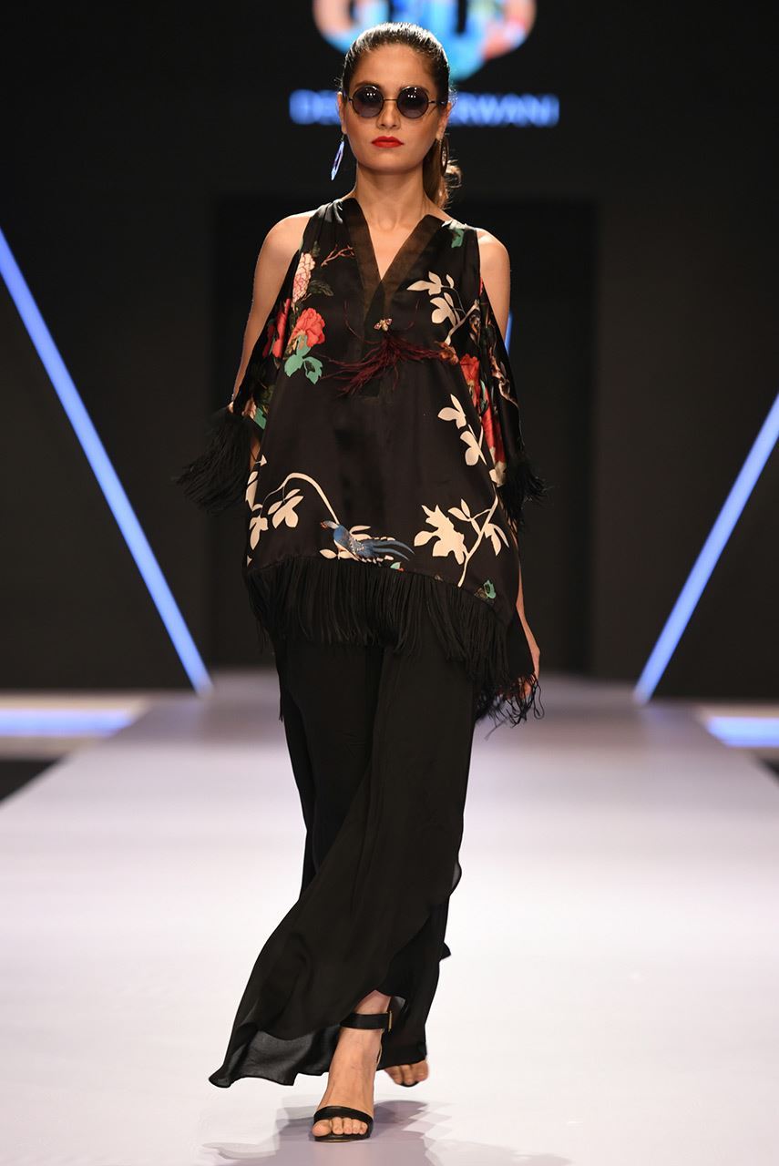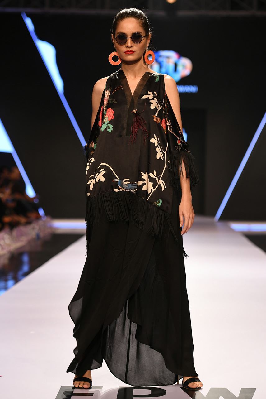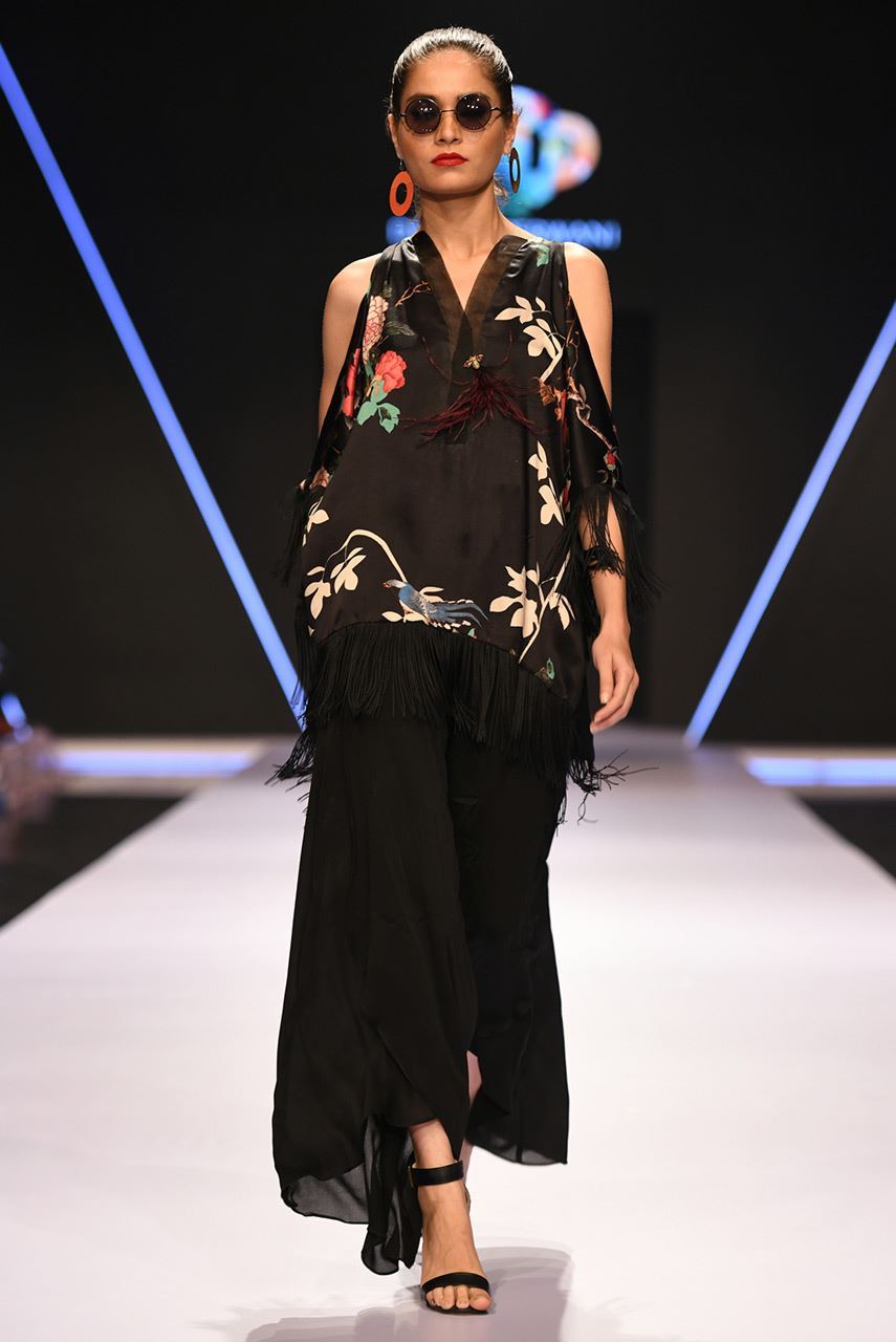 Printed pure charmeuse open-shoulder top with fringes detail on the bottom and embellishment detail on organza placard. Styled with layered petal pants in black georgette.
