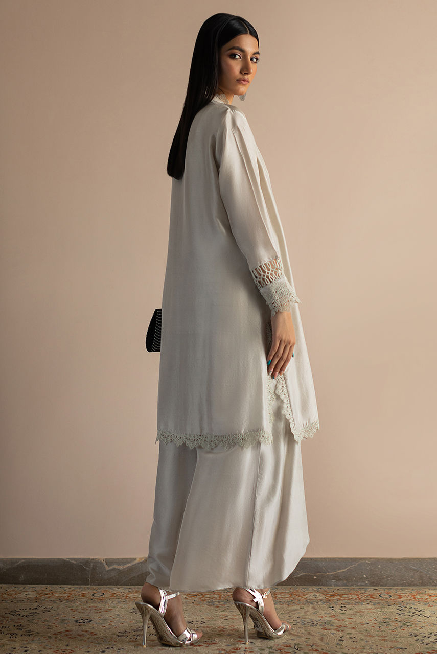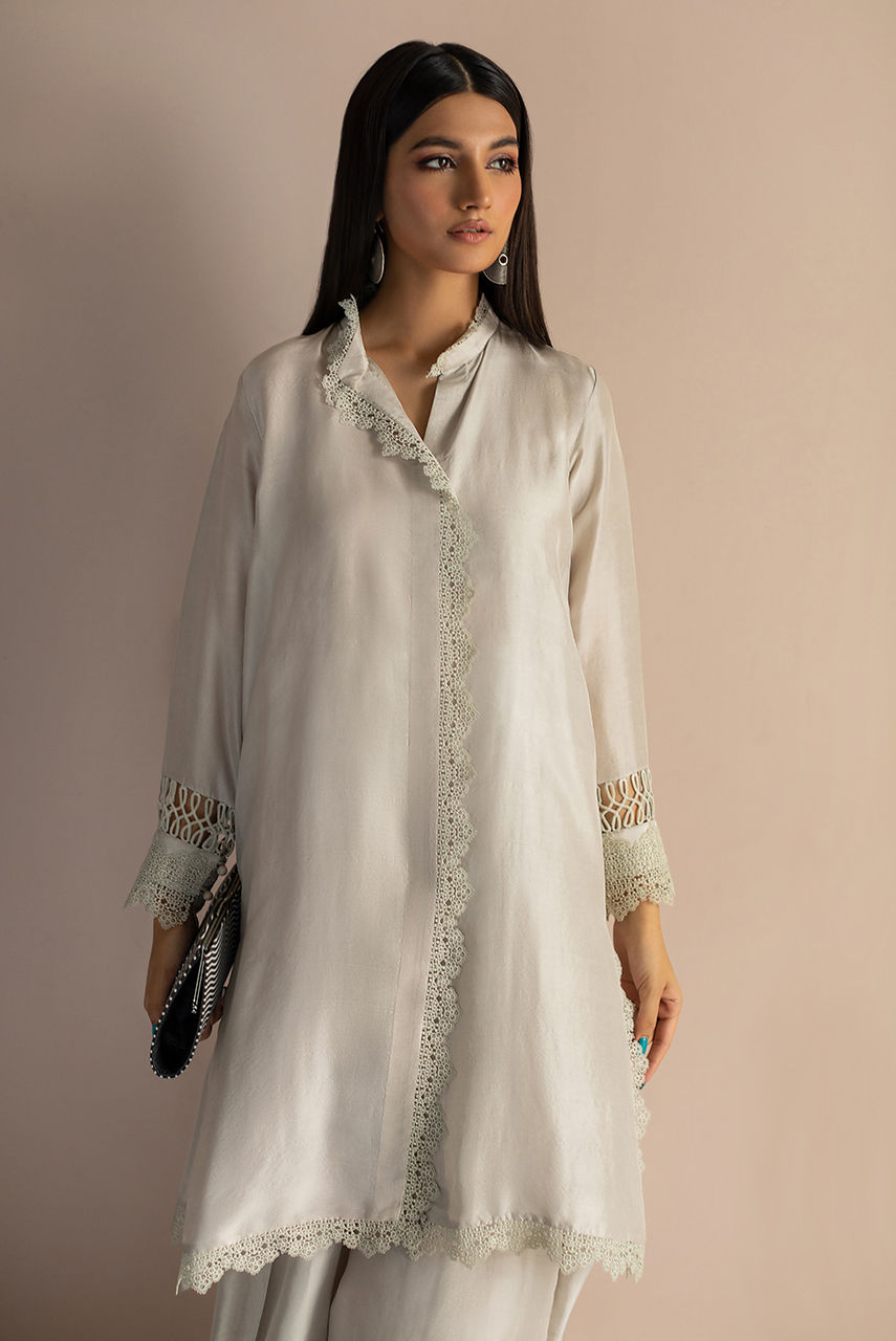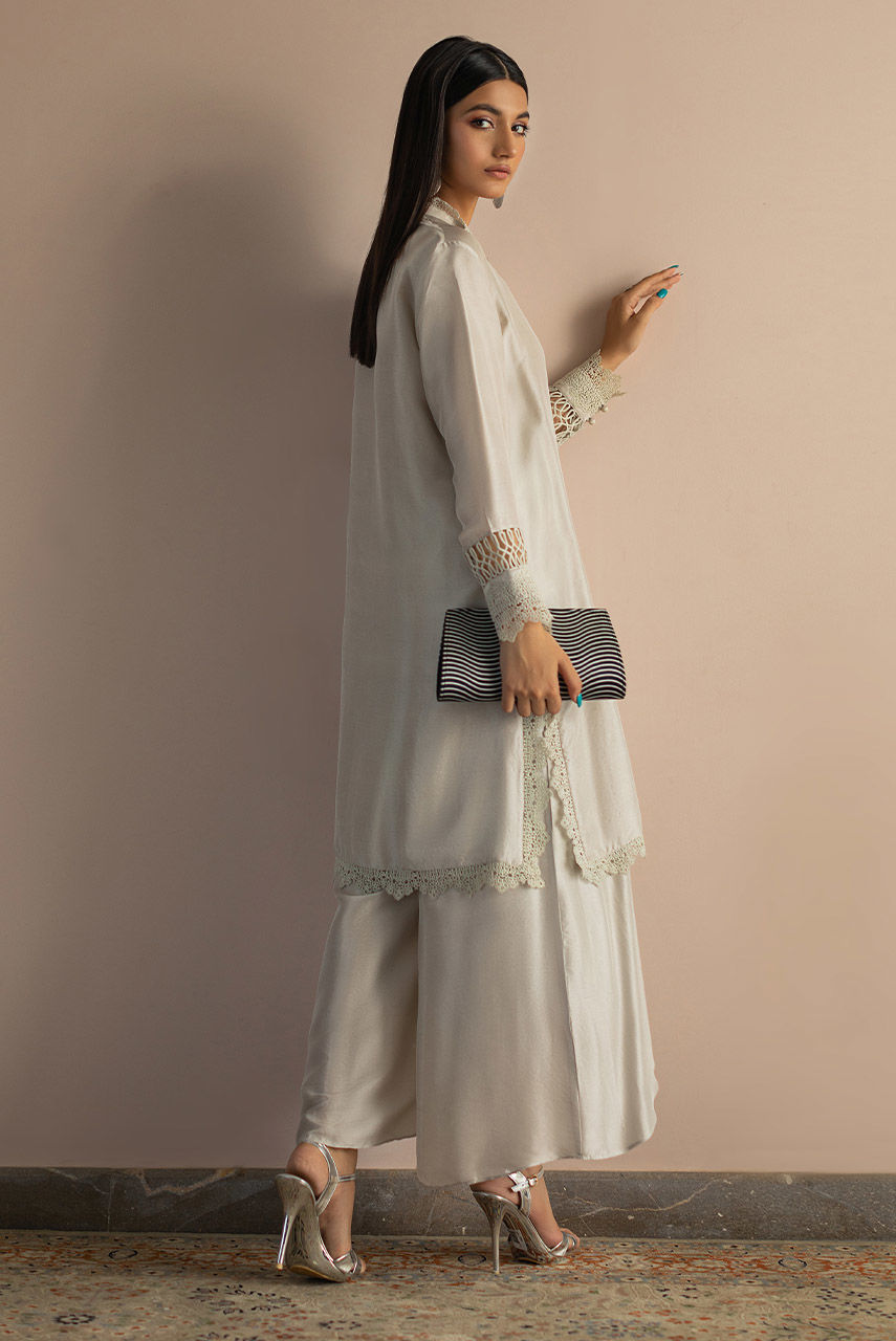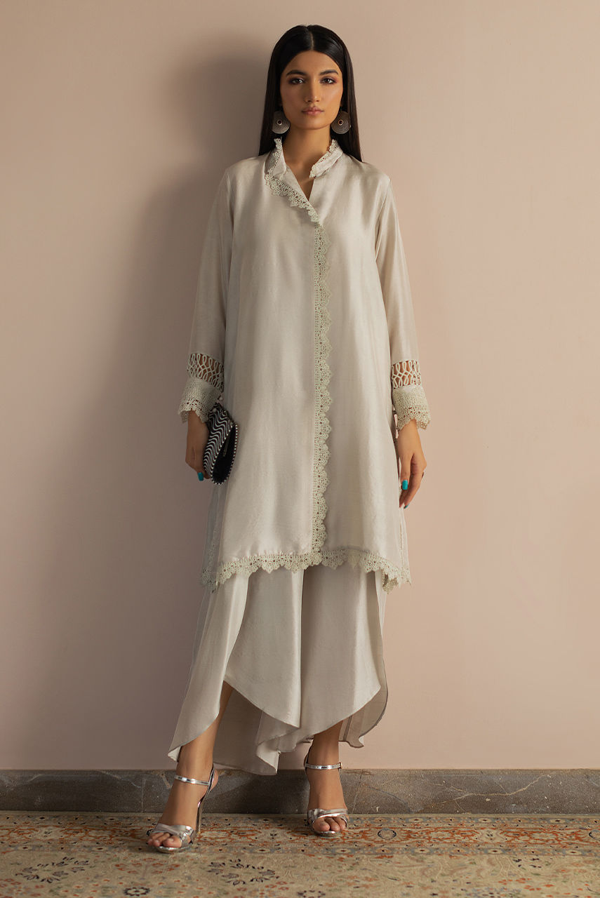 A silver pure raw silk ensemble finished with delicate cutwork laces and paired with petal pants to complete the look.