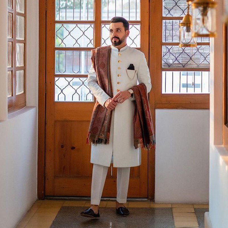 Kamil, looking absolutely dapper in this custom designed white Sherwani by Deepak Perwani