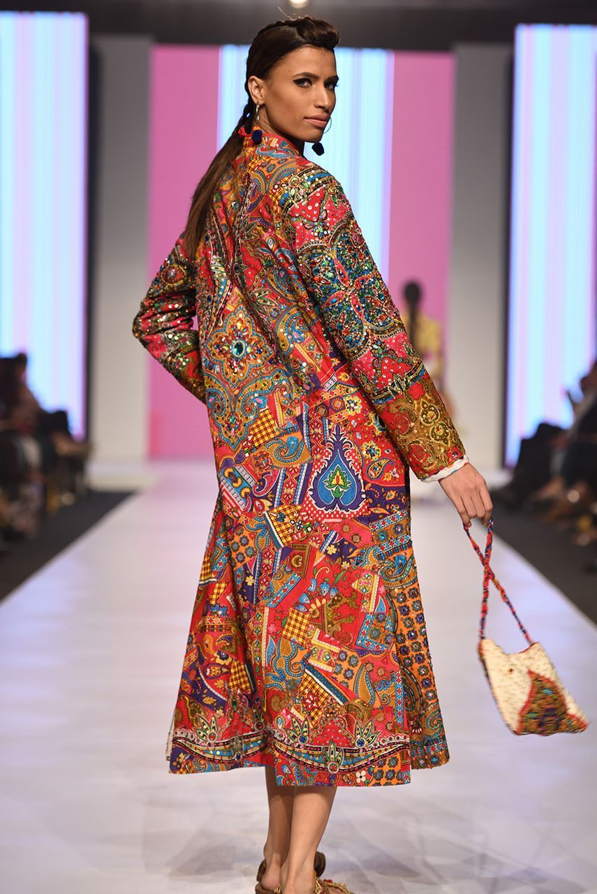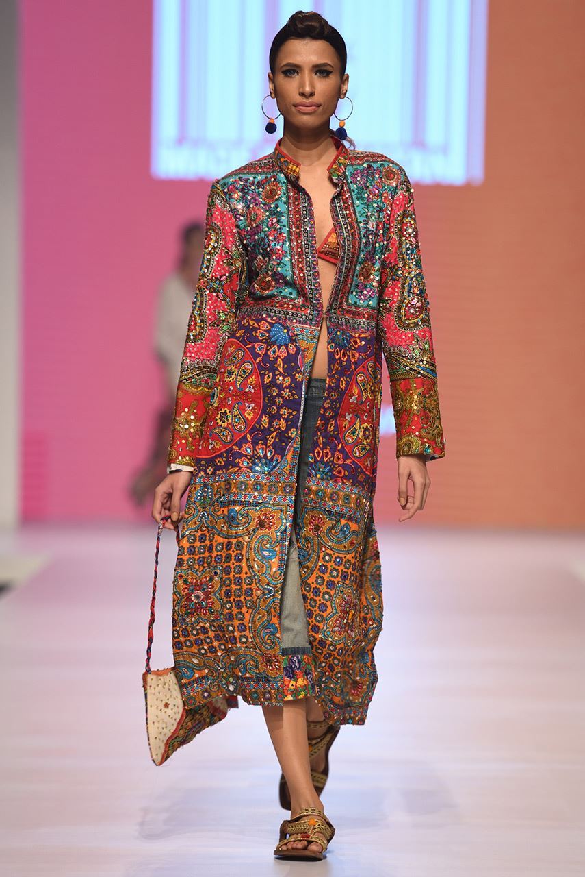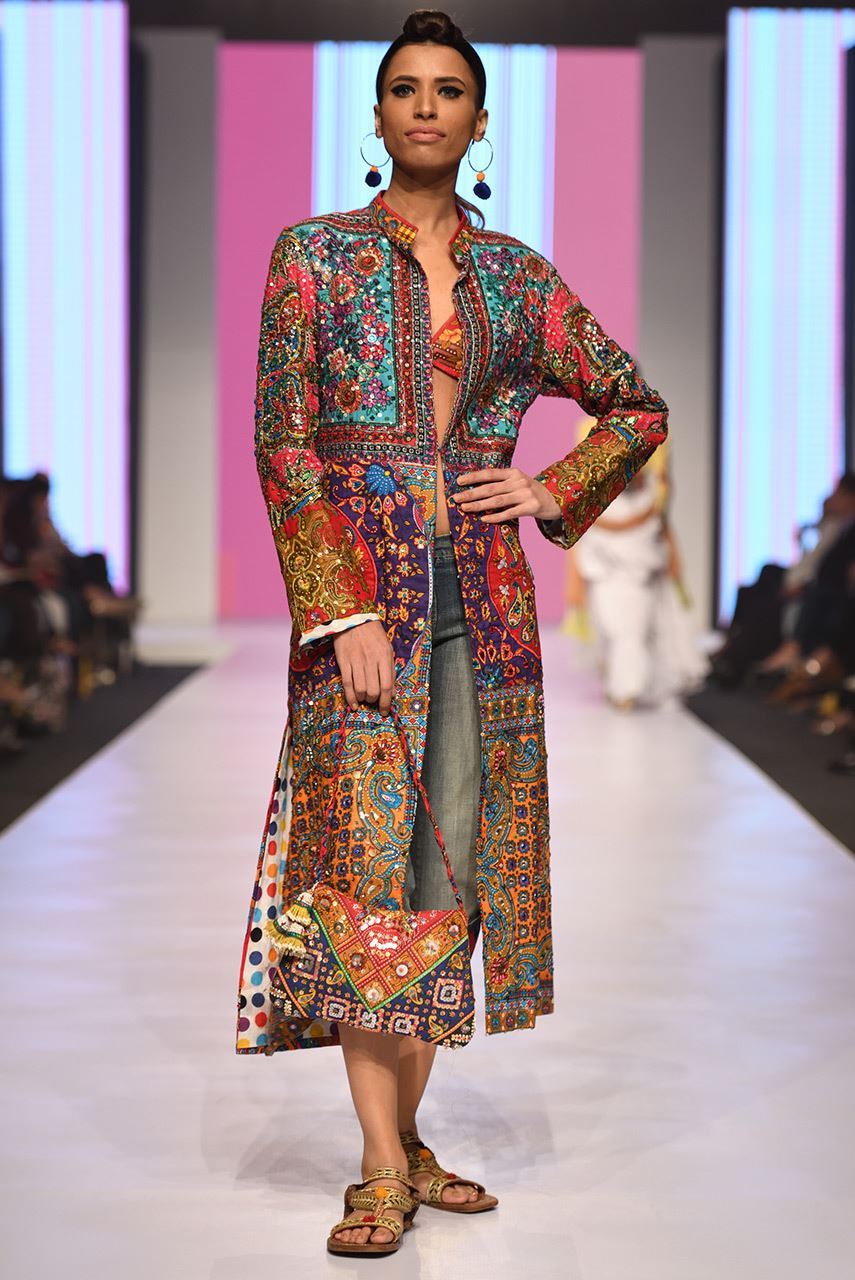Long overcoat with our signature D's philosophy applique all over paired with cropped jeans and the triangle bikini top.