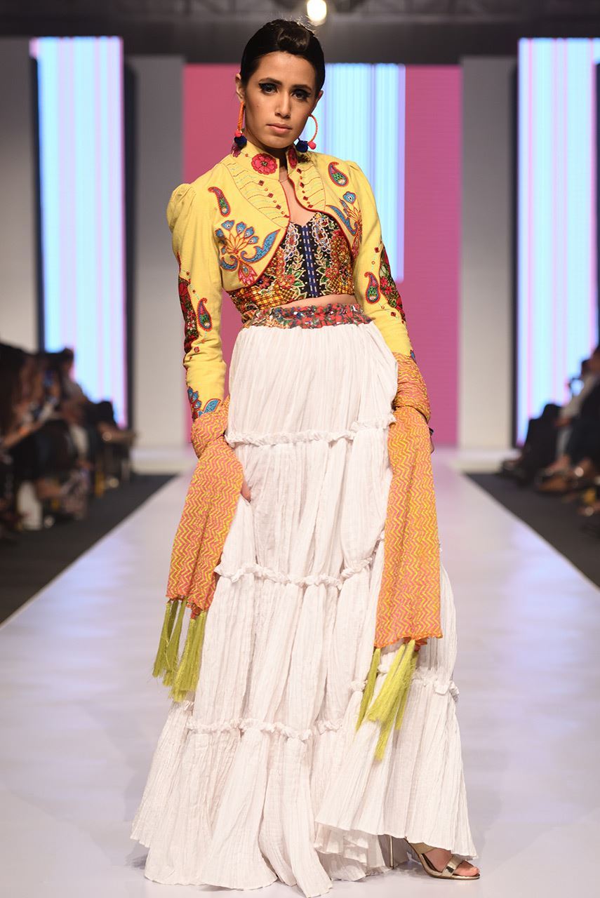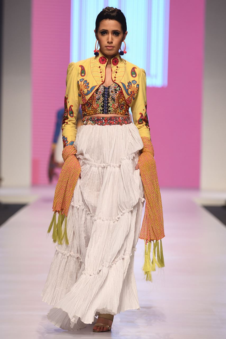 Our signature D’s philosophy cropped jacket, halter top paired with off-white crushed linen bohemian skirt and blocked printed stole trimmed with silk tassels.