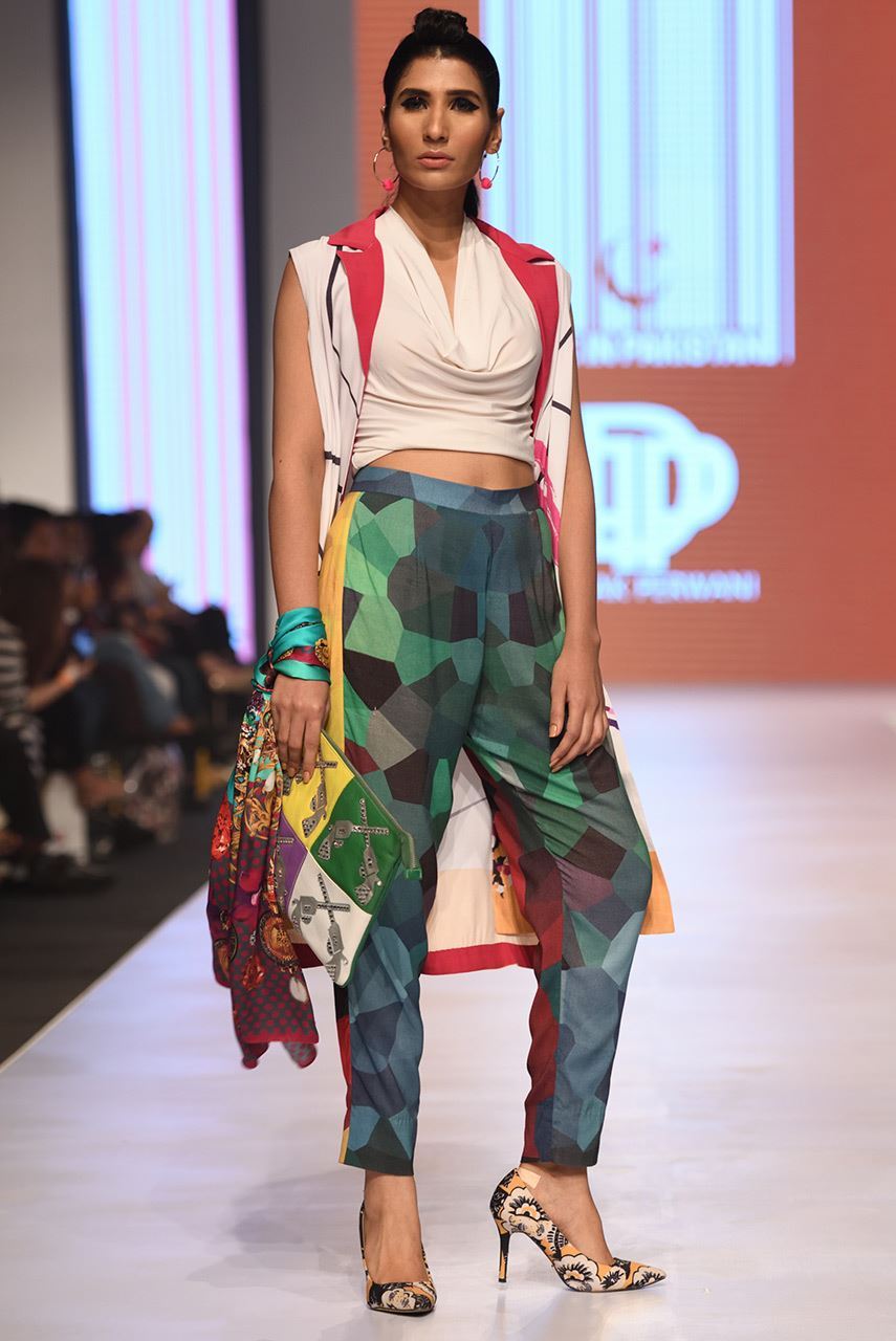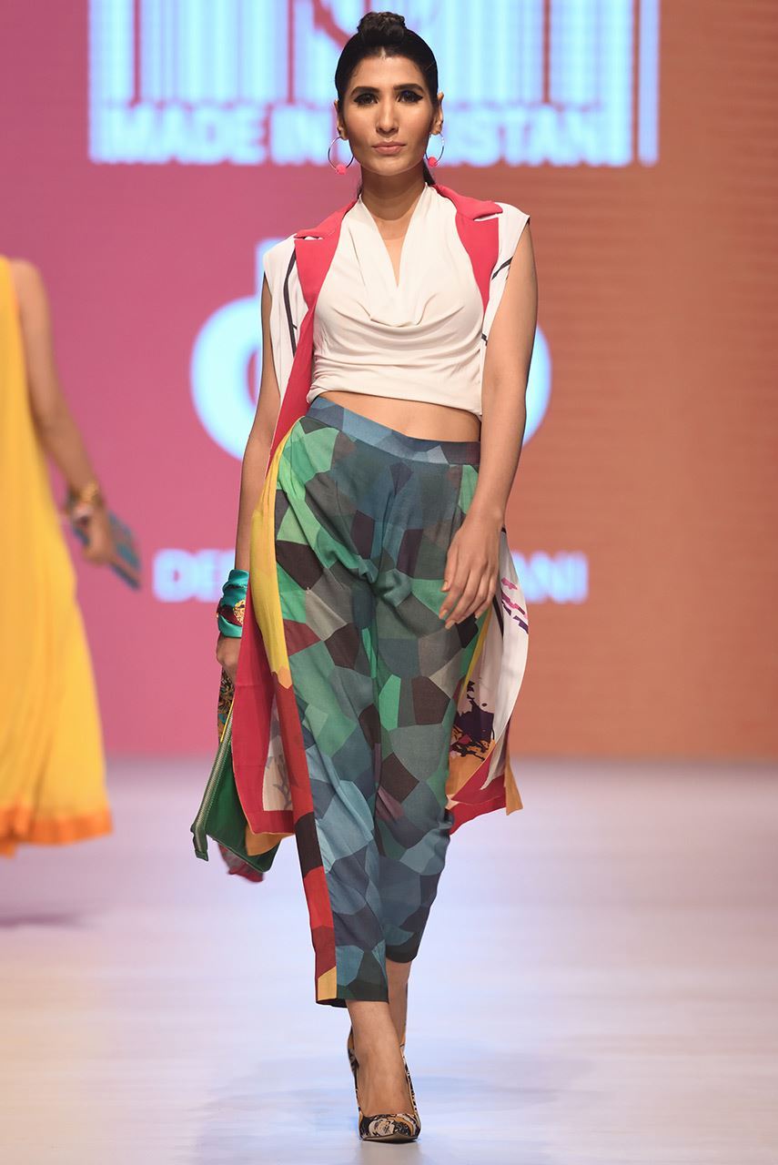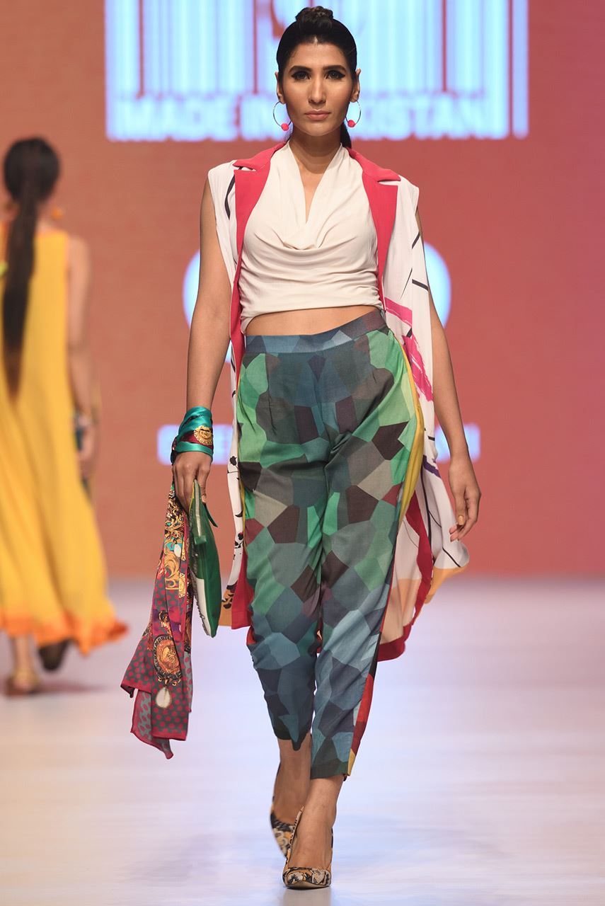 Abstract printed shrug in crepe styled with printed bootcut pants in silk.