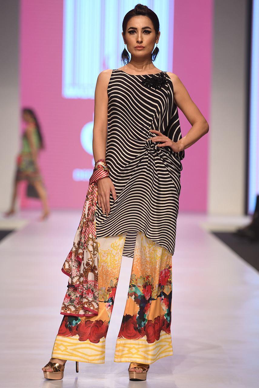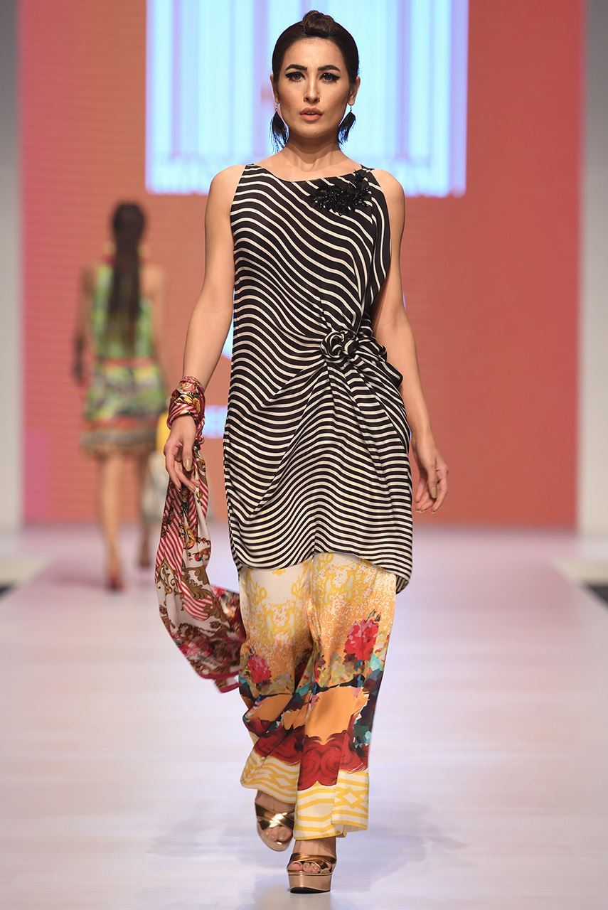 Asymmetrical draped dress in charmeuse in bold  geometric pattern accentuated with the vivid colors at the bottom.