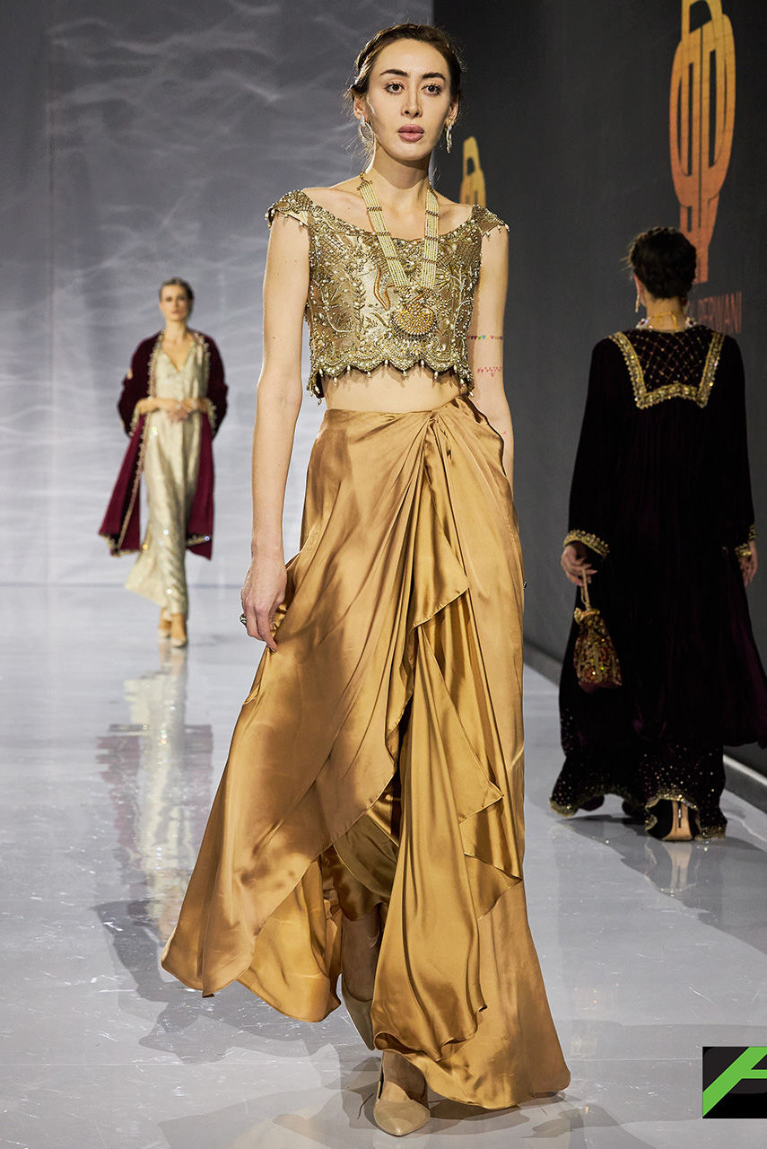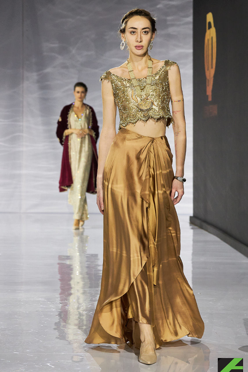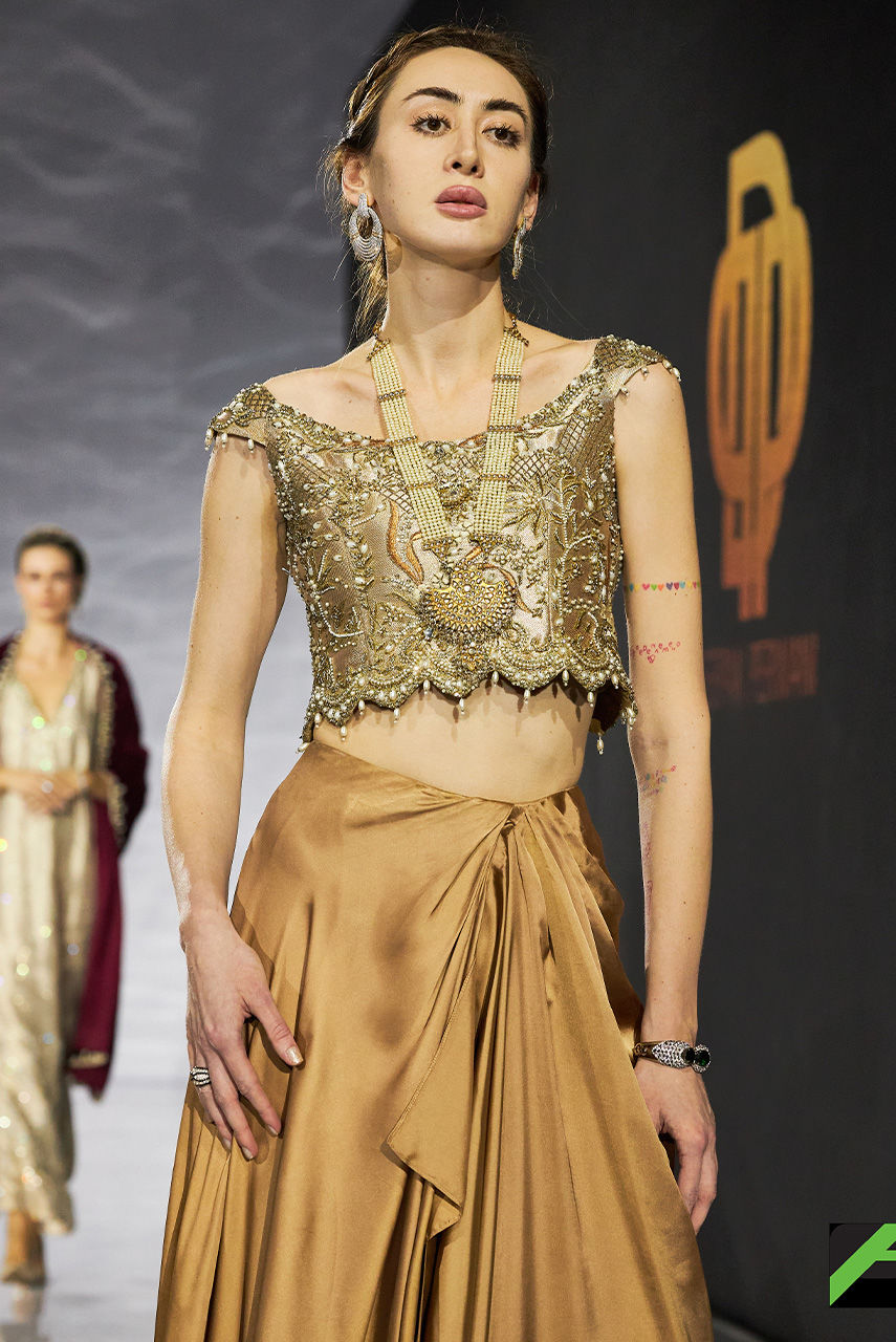 A beautifully draped shimmer silk skirt finished with a gold fringe. It is paired with a off-shoulder corset top in pure atlas fabric which is extensively hand worked in crystals and zardoze.