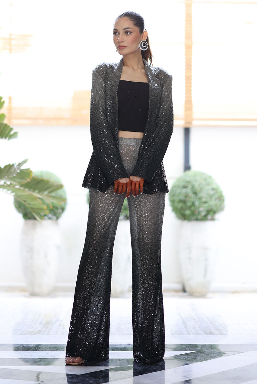A shaded sequin pantsuit.  Cut to perfection this glamorous pantsuit is sure to make heads turn wherever you go.