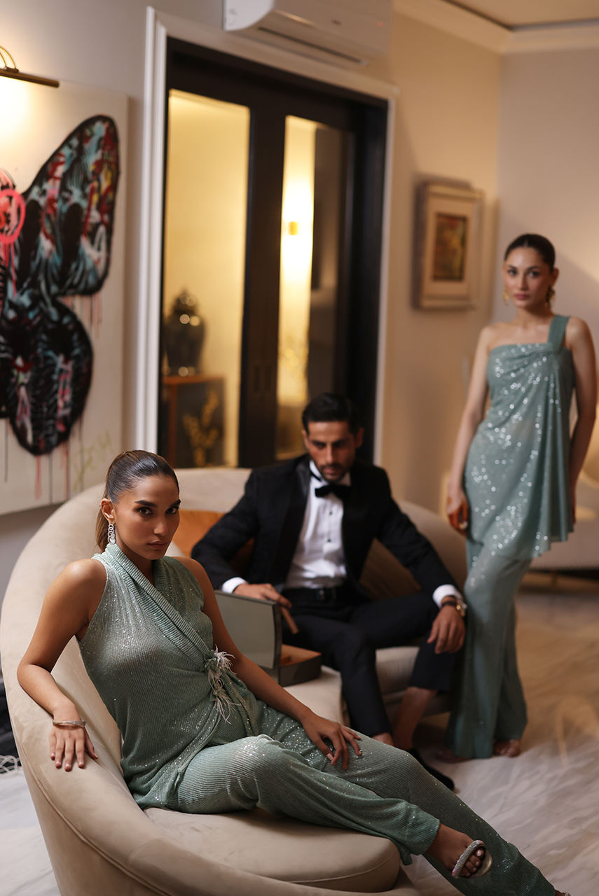 This one shoulder shaded sequin top and boot cut pants is beautifully cut to compliment the body making it comfortable yet chic