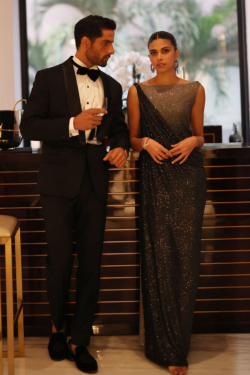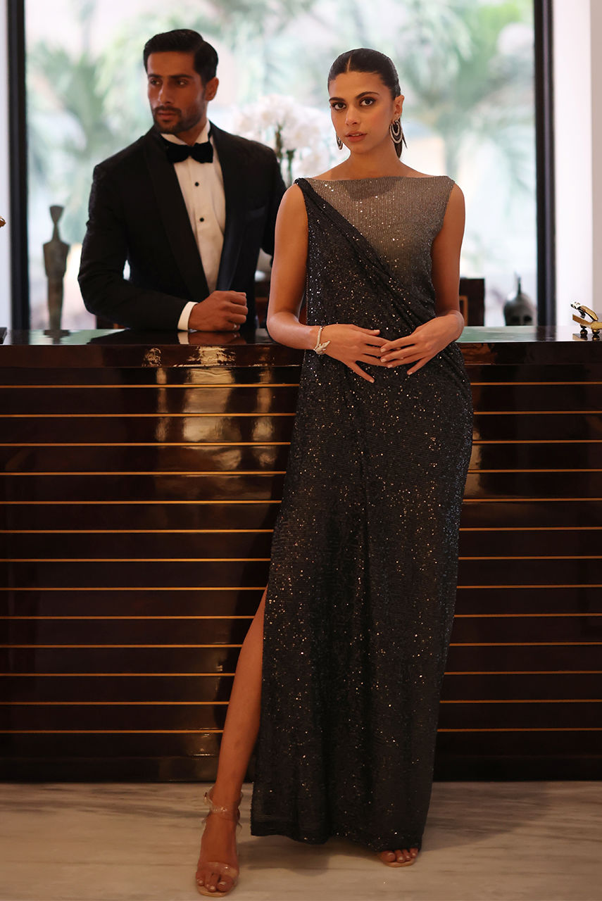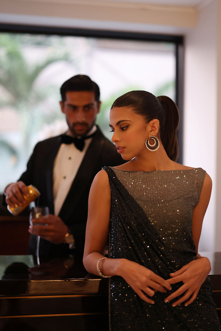 This shaded sequin drapped dress is a perfect example of premium cut and luxurious fabric. This makes a statement piece perfect for your next night out
