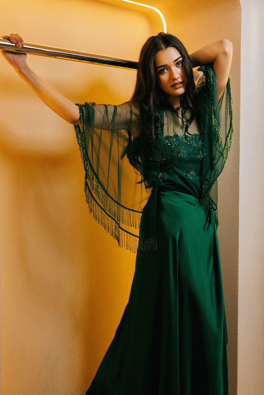 A beautifully draped silk skirt paired with a body suit in sheer French net elaborately hand embellished in crystals and beads. Styled with sheer net finished with a fringe.