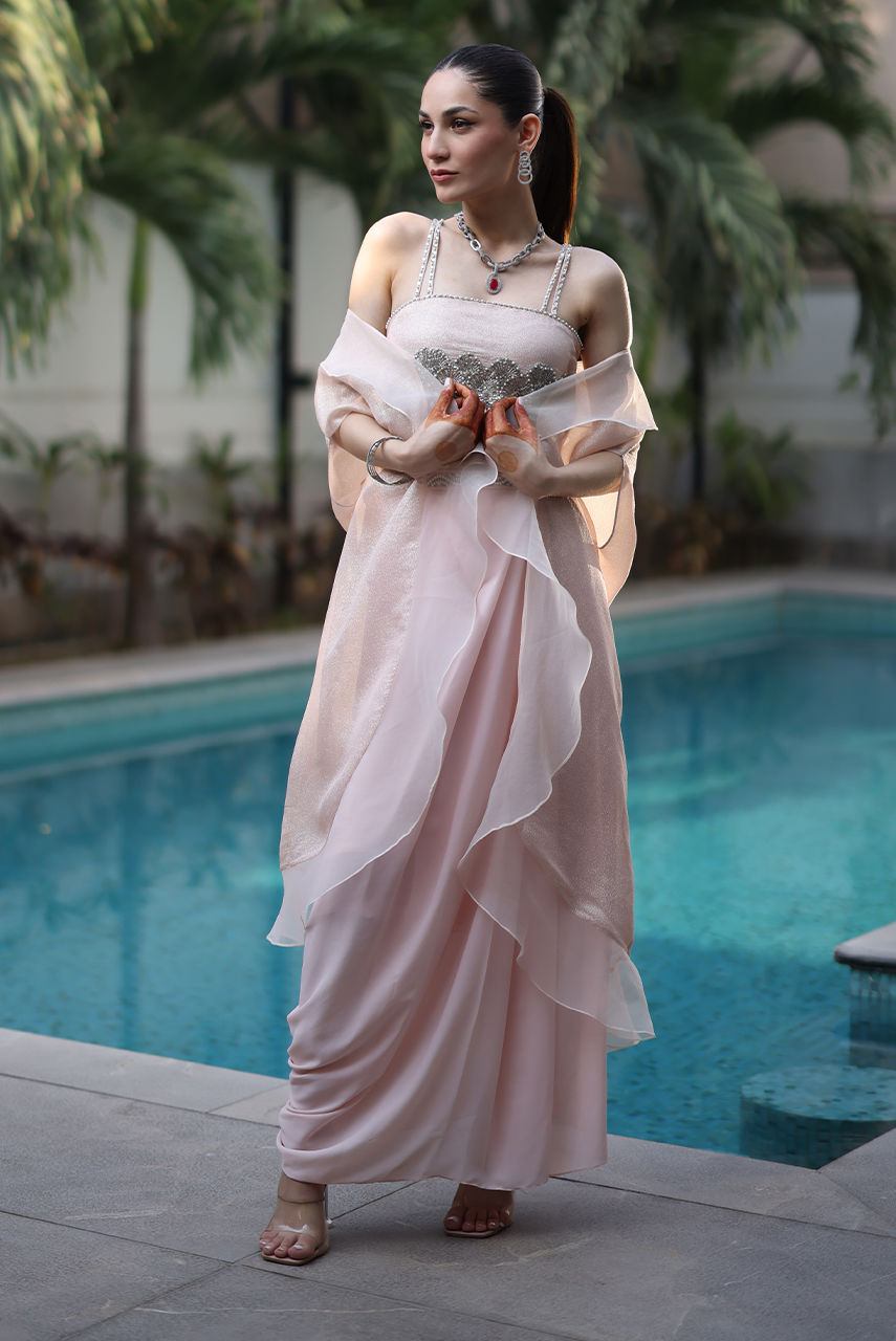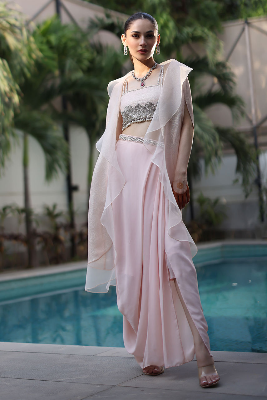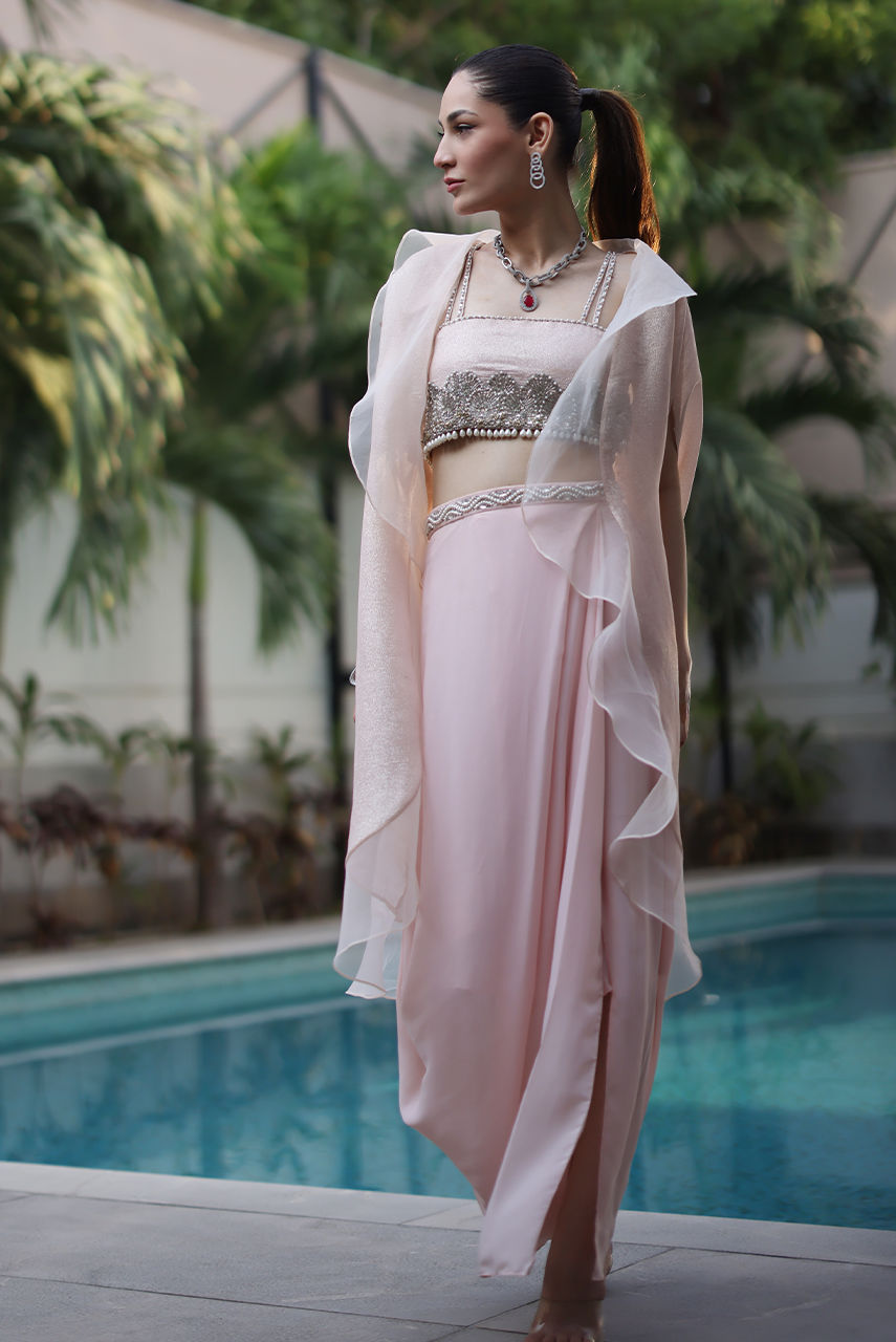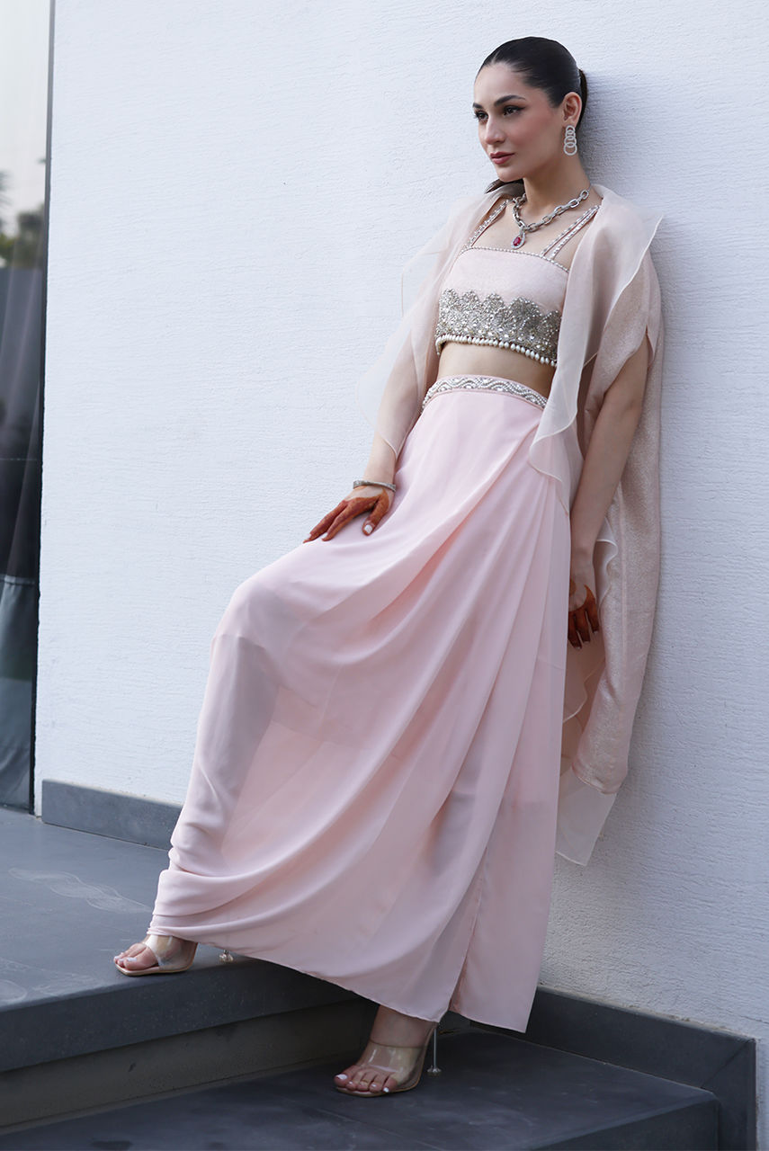 Drapped skirt with a crop top and cape. The skirt is drapped and finished with a hand worked belt in crystals and pearls. The inner is hand worked intensively in pearl crystals and katdana. The cape finished with an organza frill makes it look chic and elegant