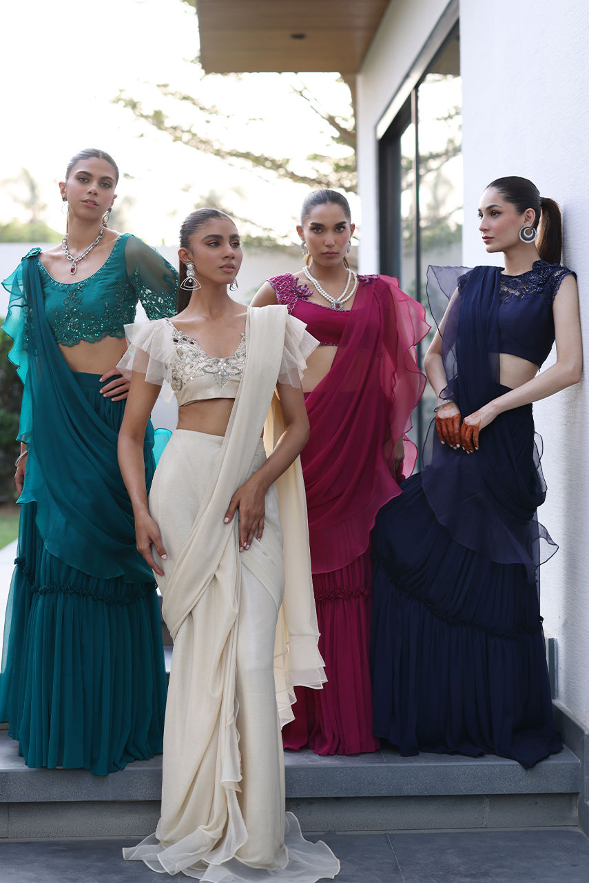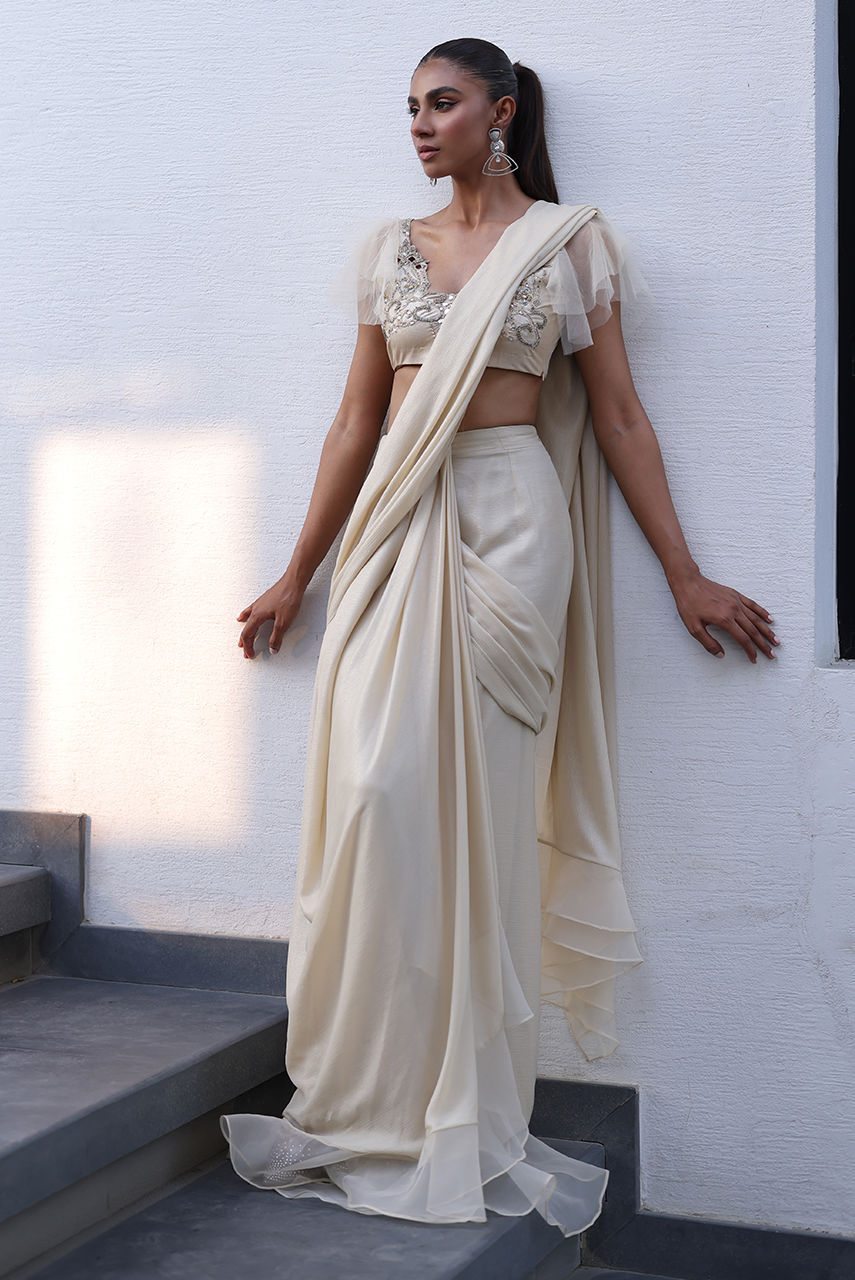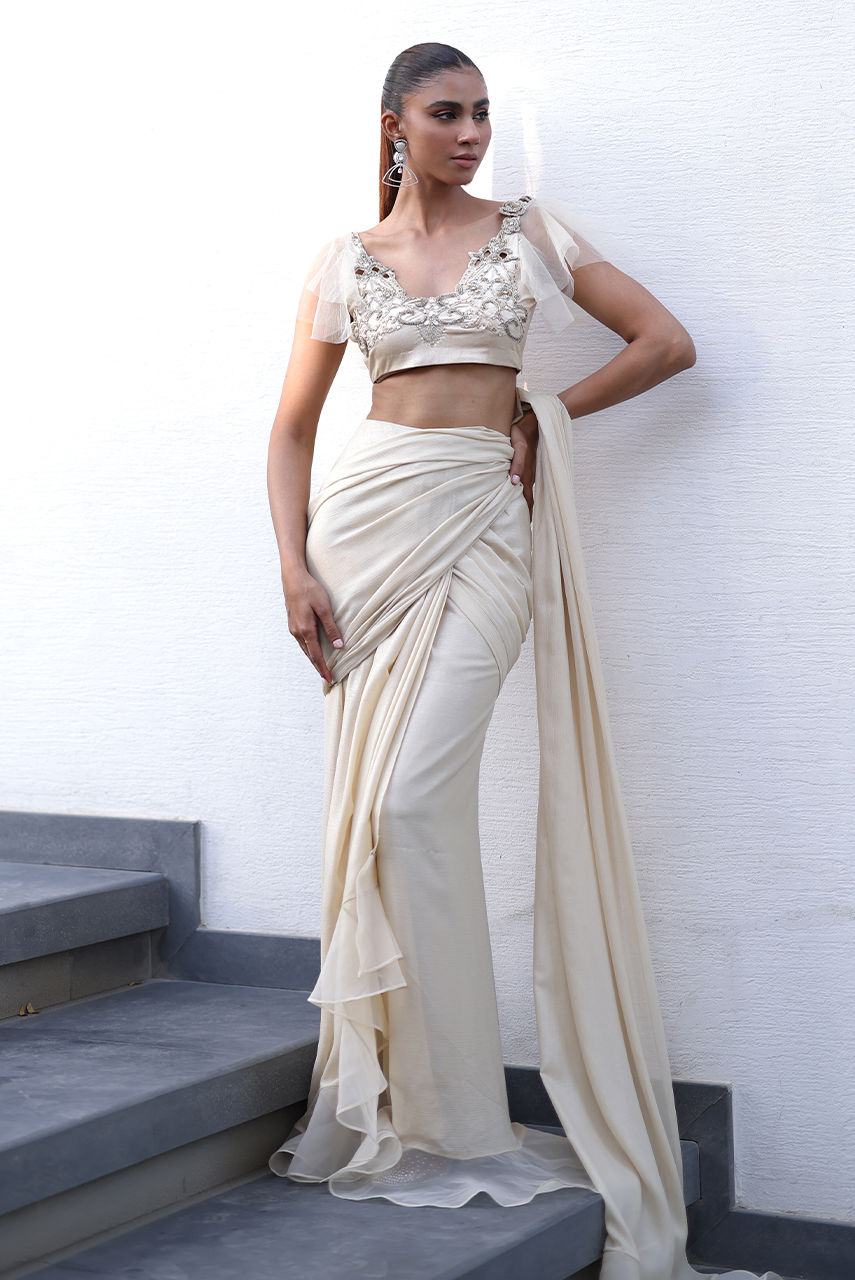 This drapped light gold sari is cut from shimmer chiffon, Georgette and organza. It is paired with a stretch l, lace and net blouse hand worked in crystals and beads making it look modern and bold.