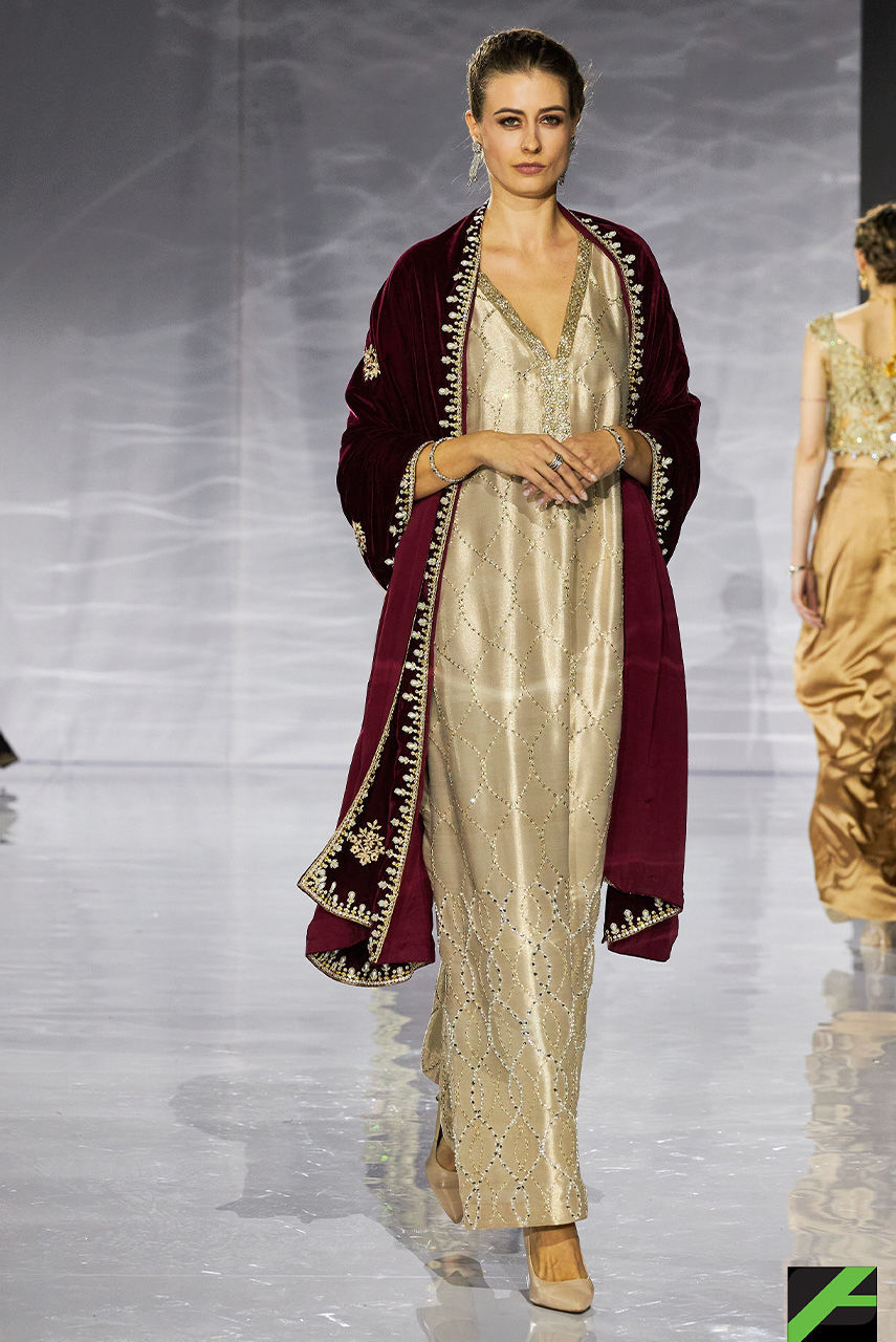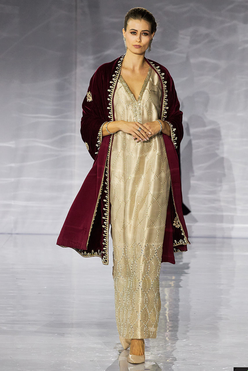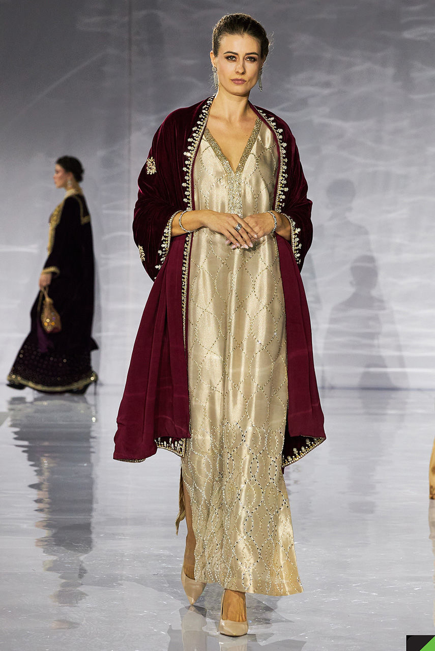 This long kaftan in gold fabric is hand worked meticulously in an og repeat pattern featuring crystals and sequin.