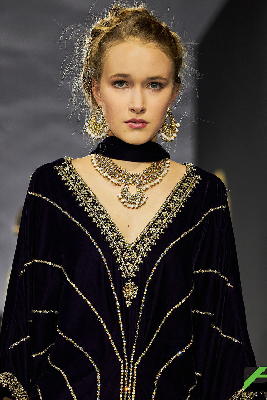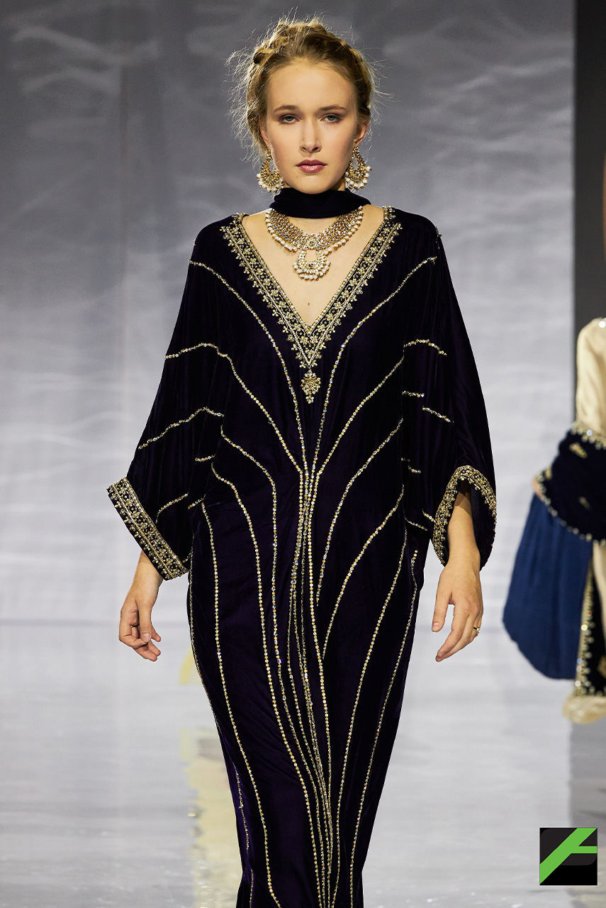 Perfect for your soirées and any festive occasion. This dark purple velvet kaftan is hand worked meticulously in crystal and zardozi and cut to perfection in a luscious velvet.