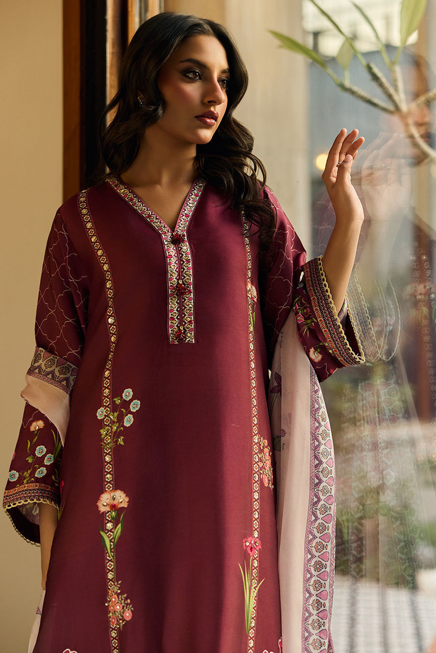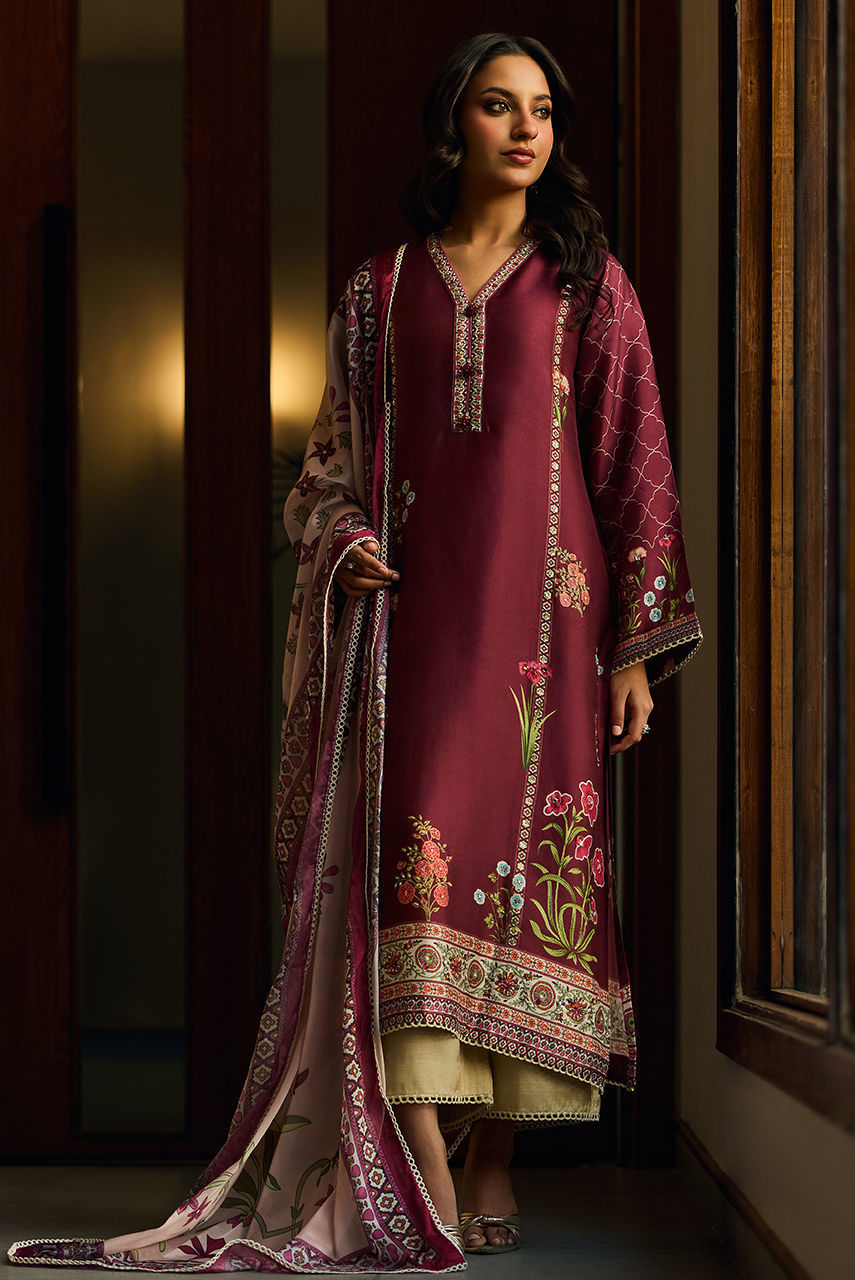 A pure silk printed shirt featuring flora and fauna layered beautifully in a warm colour palette, this print is classic and effortlessly elegant. Hand worked in stones, diamanté, sequins and beads. It is paired with a digital print dupatta finished with lace. Featuring a plain trouser