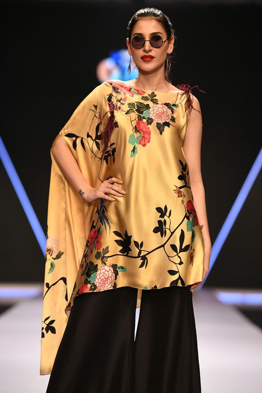 Printed asymmetrical dress in charmeuse with feathers and handcrafted embellishment details on it.  Styled with wide leg pants in raw silk with fringes at bottom.