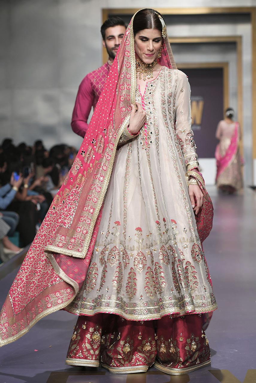 A maysuri kalidar featuring hand screen print, gotta, zardozi and mirror work. Paired with a two Tone gharara with extensive screen print and hand gotta, pearl and sequin work. The crepe shawl is extensively screen printed and comes with hand worked gotta, mirror and pearls