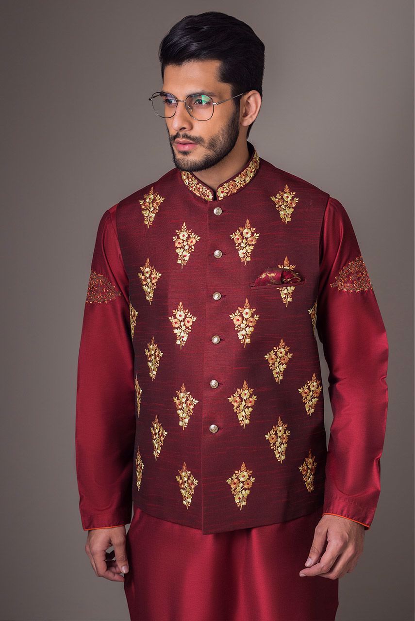 Maroon raw silk waist coat with embroidered motifs all over the front, collar and an embroidered motif on the back