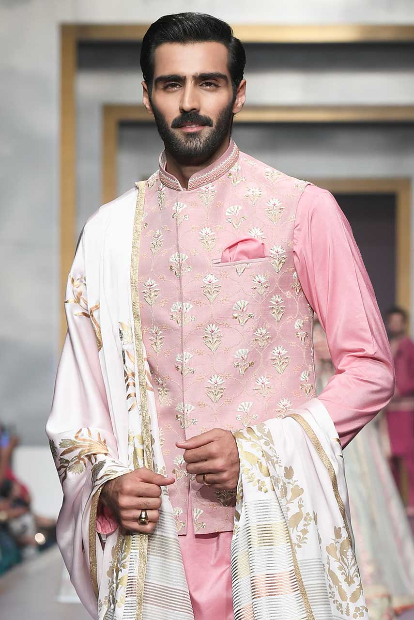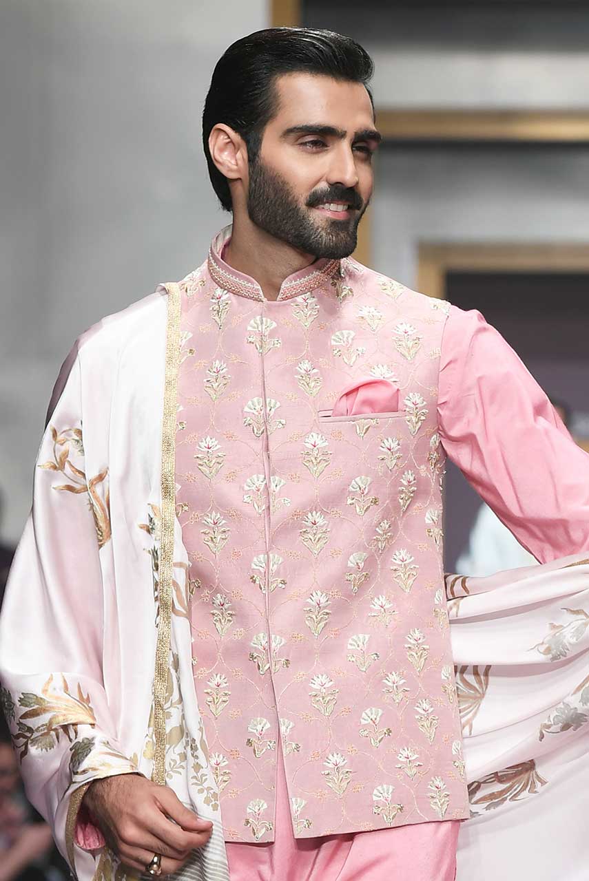 Pink raw silk hand embroidered waistcoat.