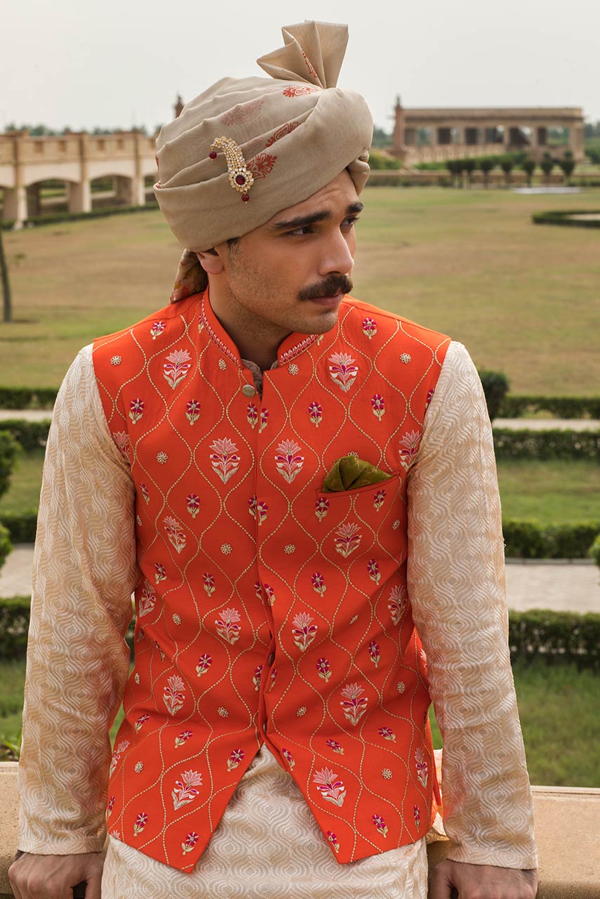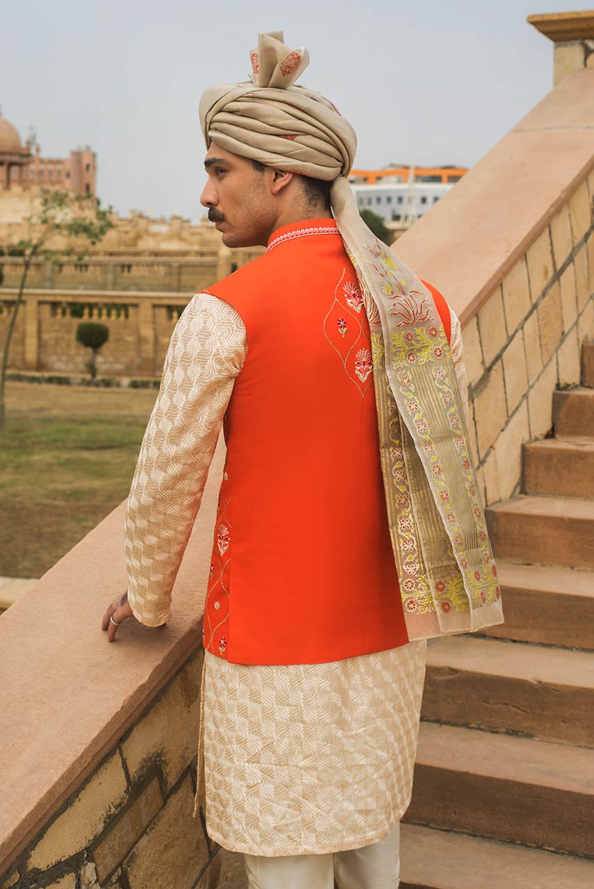 Waist Coat: Raw silk embroidered waist coat Kurta: Gold raw silk embroidered kurta and cotton silk pajama with wooden loop button deatiling