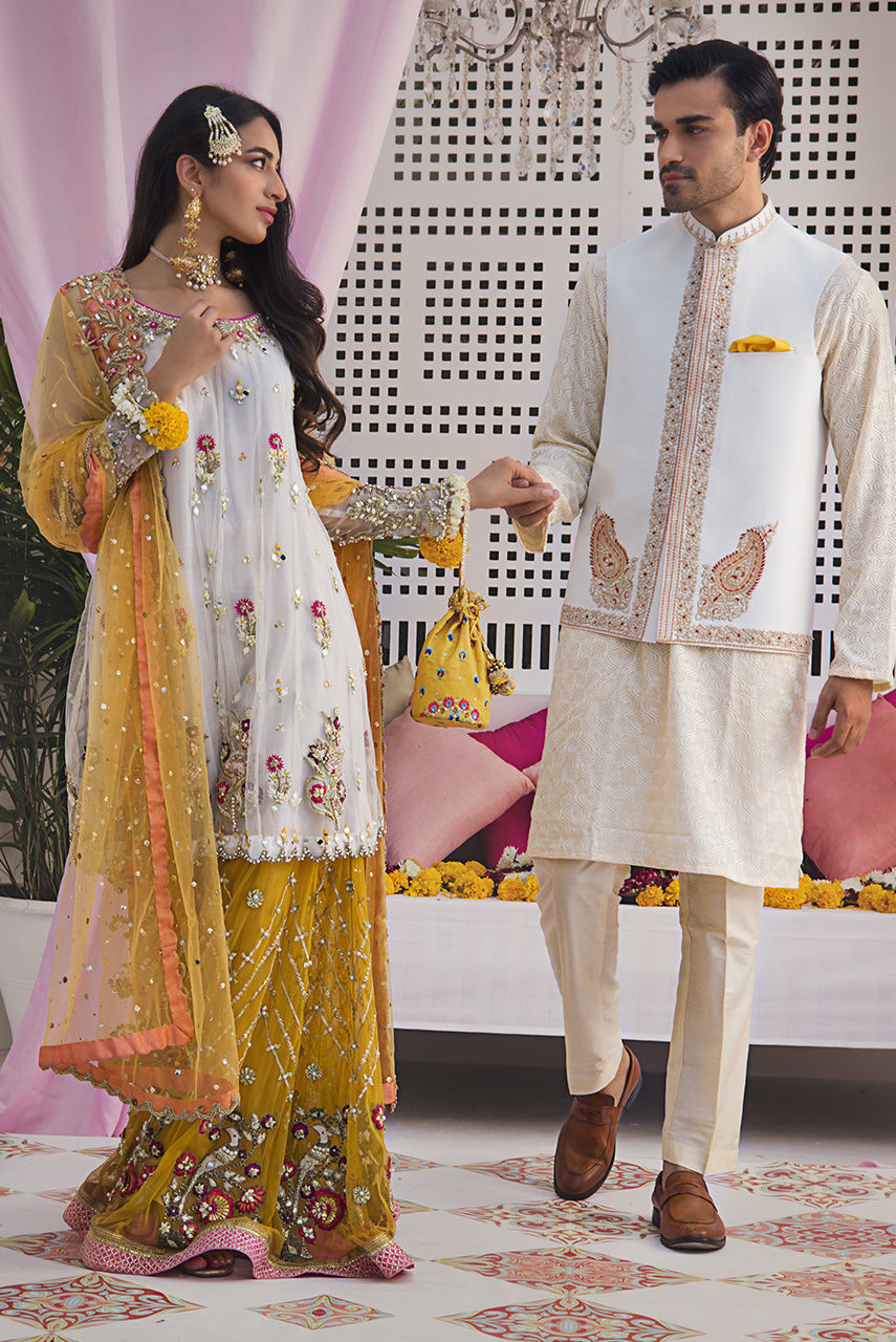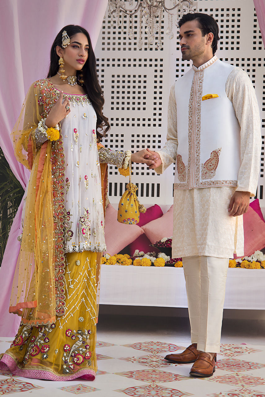 A white raw silk embroidered waist coat with a self embroidered beige gold kurta pajama.