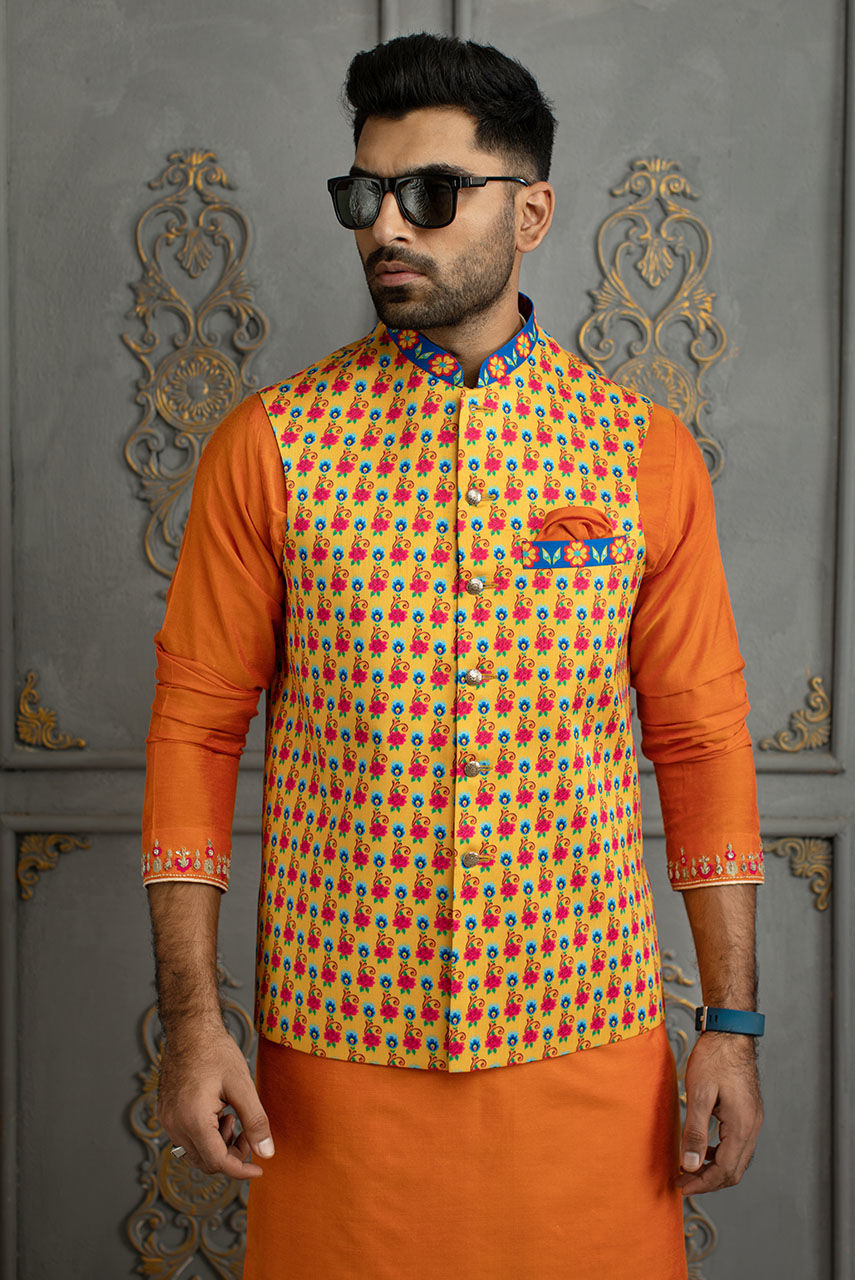 A digitally printed raw silk waist coat perfect for the festive season.