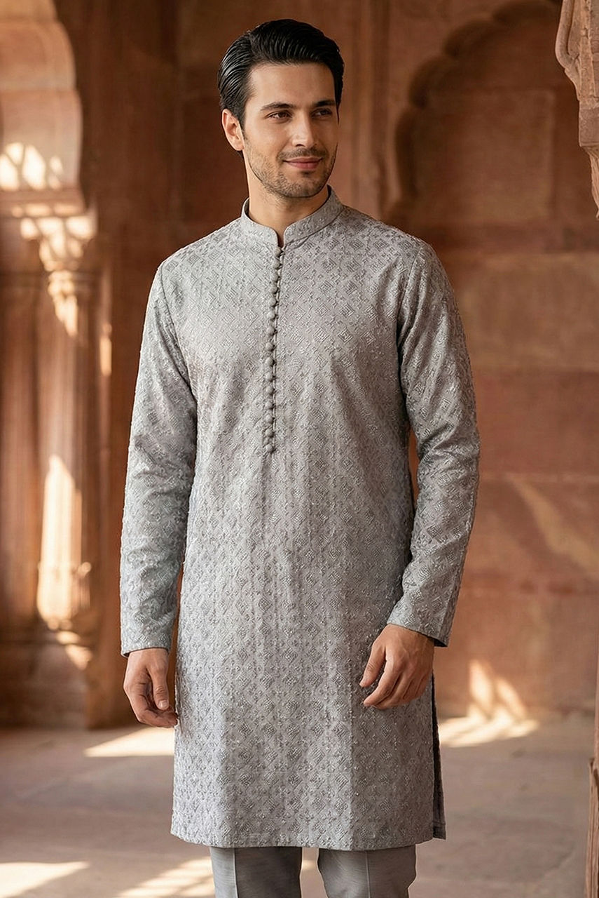 The Signature Grey Chikan Ensemble Define your festive wardrobe with this understated yet luxurious grey ensemble. The centerpiece is a meticulously crafted Kurta Shalwar in intricate Chikan fabric, offering a textured, airy feel perfect for the season. It is paired with a premium Raw Silk waistcoat that adds a layer of smooth structure and sheen. The look is finished with the signature Deepak Perwani logo embroidered on the chest pocket, serving as a mark of authentic designer craftsmanship.