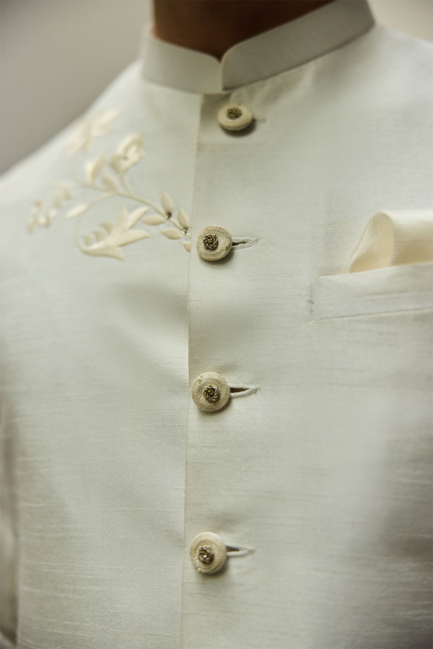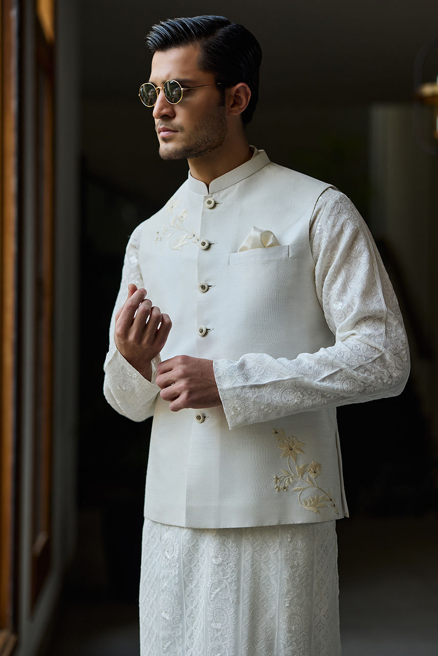 An embroidered raw silk waist coat paired with a a meticulously crafted Kurta Shalwar in intricate Chikan fabric, offering a textured, airy feel perfect for the season.