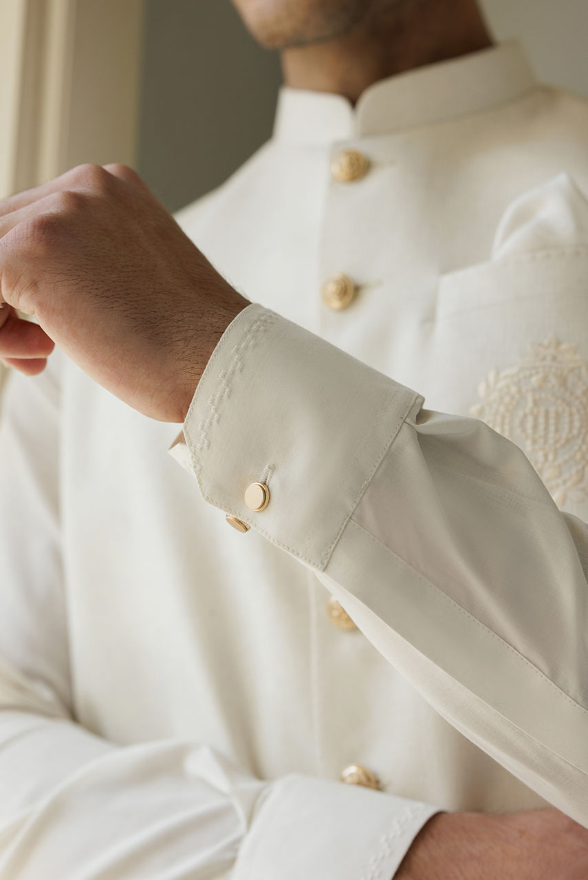 White khaddar waist coat with crafted buttons and the iconic DP logo.