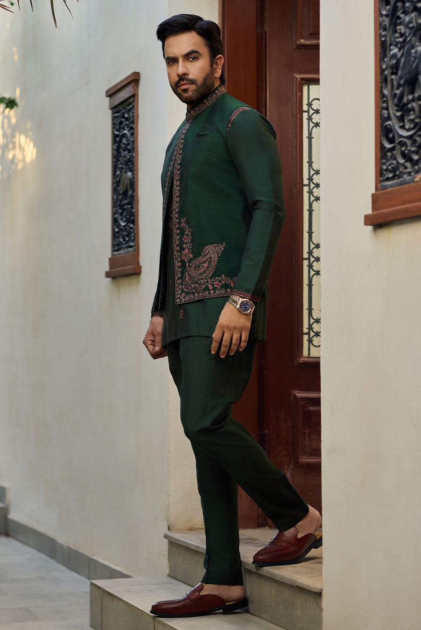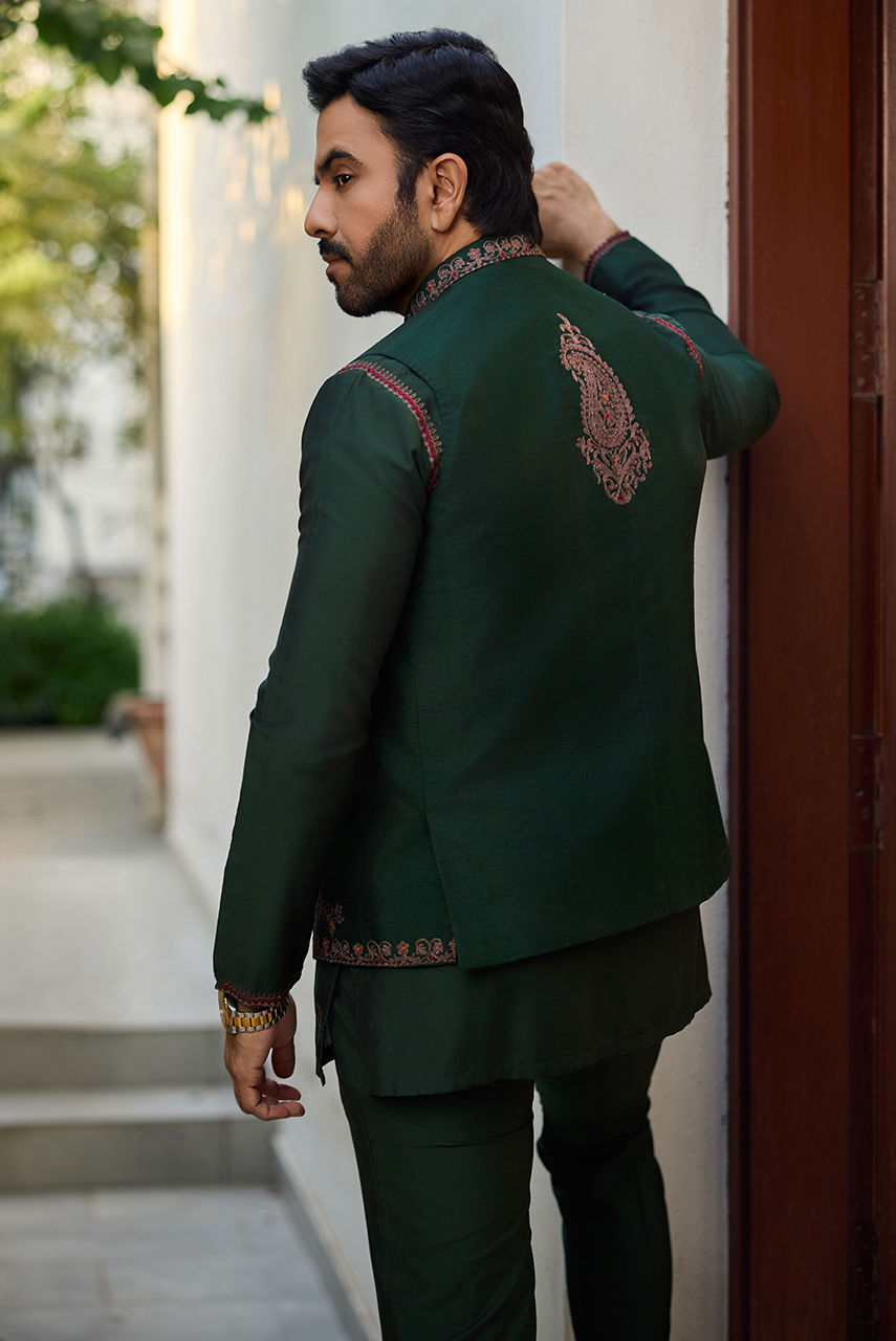 A masterpiece of Pakistani ceremonial wear, this waistcoat is crafted from rich Raw Silk in a lustrous shade embrald green. The entire front surface, the structured Band collar, and the hem are completely enveloped in intricate, high-density Resham and Zari hand-embroidery. The repeating geometric and floral motifs create a rich, tactile tapestry that reflects light and provides depth. Paired effortlessly over an embrald green matching kurta, this waistcoat is the ultimate investment piece for a groom's sibling, a wedding guest, or any high-end festive occasion.