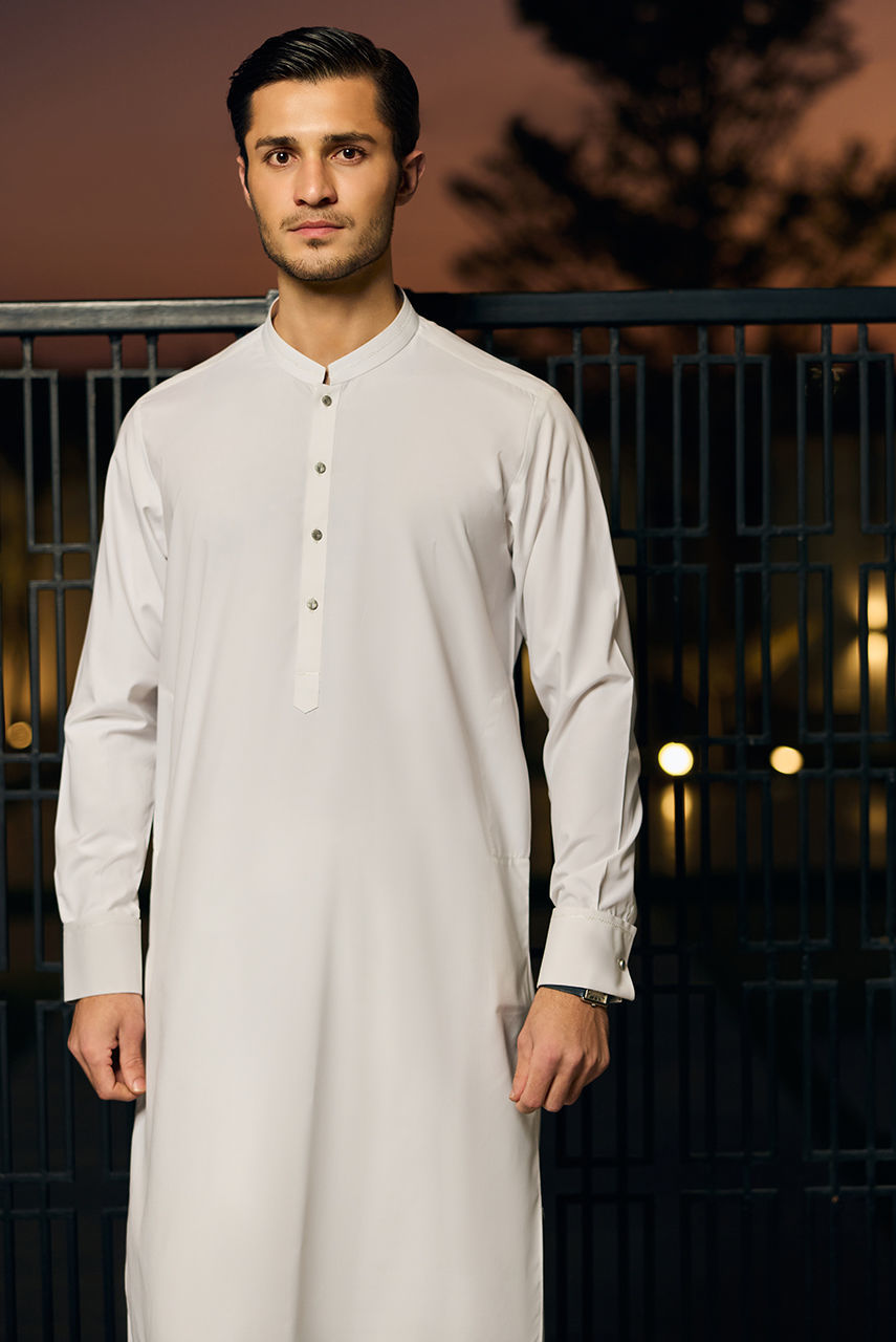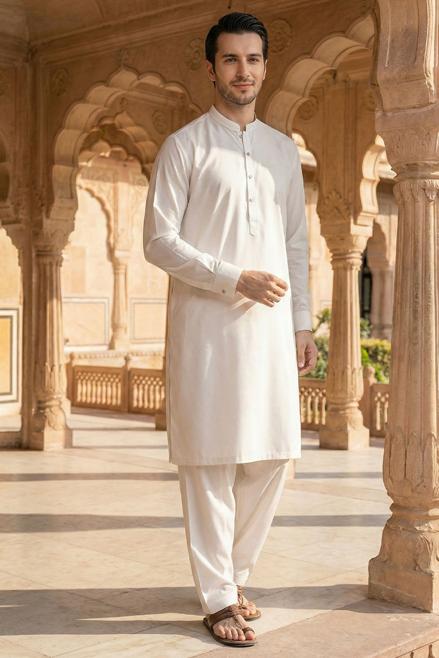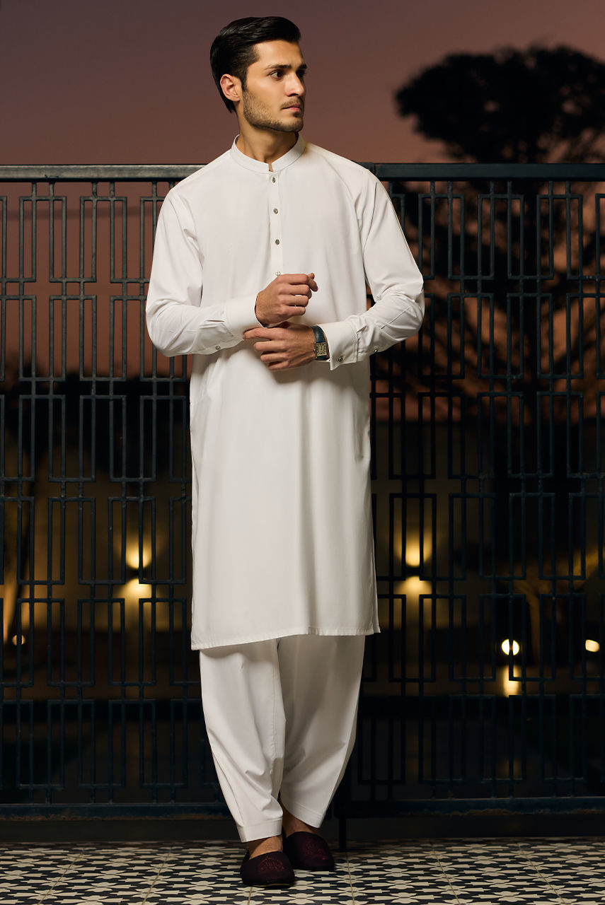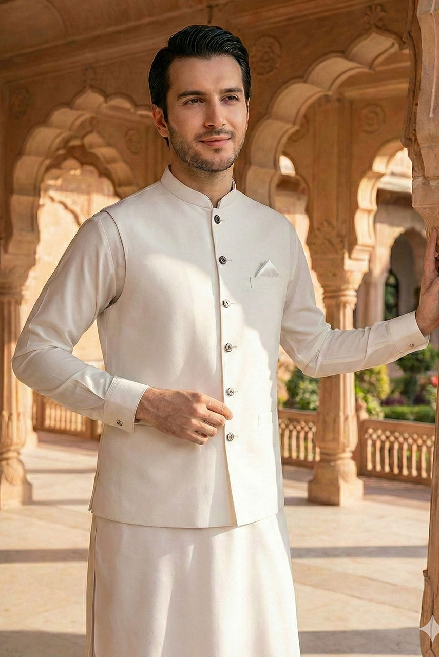Define understated luxury with this pristine monochromatic ensemble. The foundation of the look is a classic kurta and shalwar crafted from premium Boski linen, known for its fluid drape and soft, cool feel against the skin. It is layered with a structured waistcoat made from high-quality suiting fabric, featuring sharp tailoring, a mandarin collar, and contrasting dark buttons that add a refined focal point. This piece is the epitome of ceremonial elegance, perfect for Eid prayers or formal evening events.