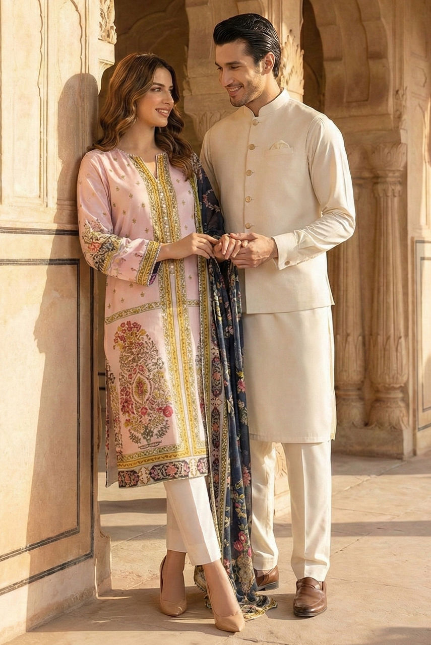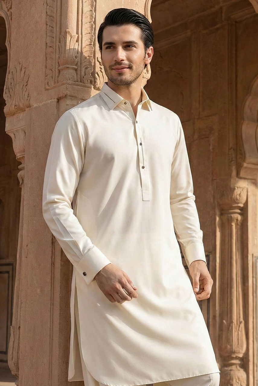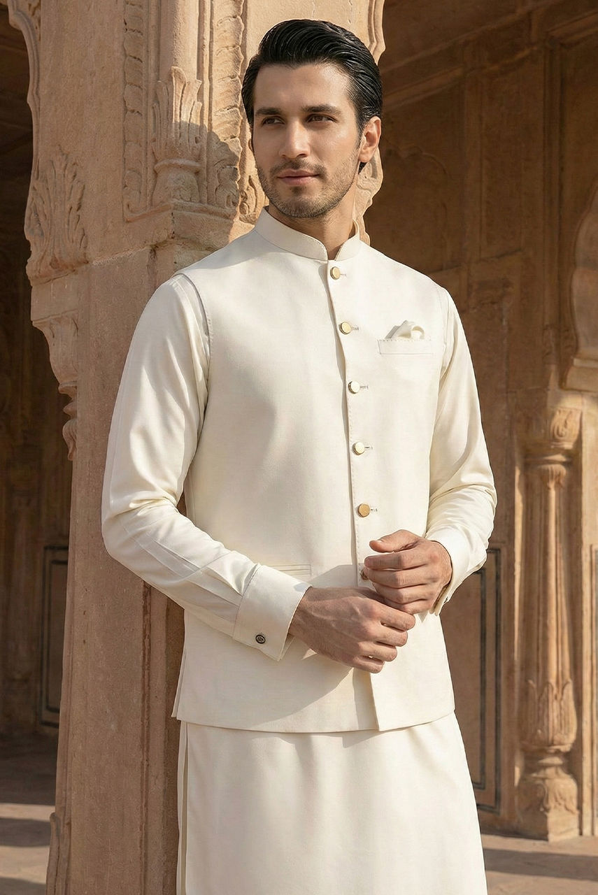 Exude timeless sophistication with this pristine, monochromatic look designed for the modern gentleman. This ensemble pairs a luxuriously soft Boski linen kurta shalwar with a structured suiting fabric waistcoat, creating a subtle interplay of textures in a matching cream hue. The waistcoat features a sharp mandarin collar and is punctuated by distinctive gold-tone metallic buttons that add a touch of regal refinement. Finished with a crisp pocket square, this outfit is the epitome of understated luxury, perfect for festive occasions and formal gatherings.